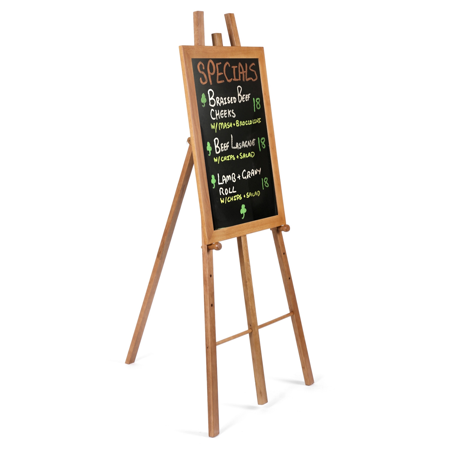 Modern staffeli i beiset tre med beskyttelseslakk og dobbelsidig lysebrun kritt-tavle i størrelse 60x80 cm.