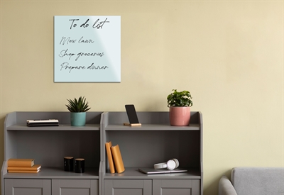 Stilren hvit glasstavle laget av herdet glass med magnetisk overflate, for sikker bruk hjemme eller på kontoret. Tavlens tettsittende og diskrete design sørger for at den sitter helt inntil veggen.
