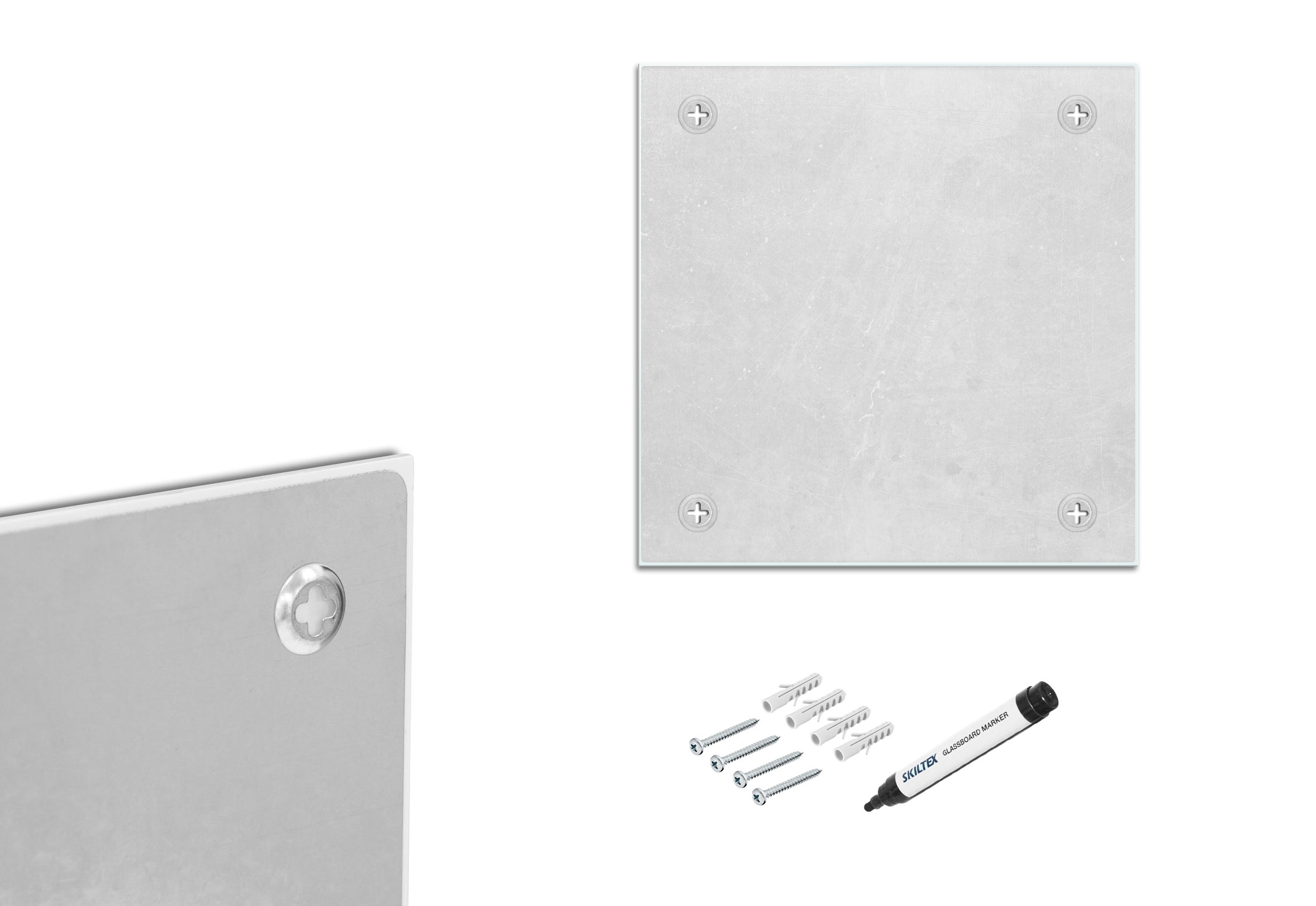 Baksiden har 4 monteringshull, ett i hver hjørne, som gir muligheten for å henge opp glassplaten både i høy- og bredformat. Leveres komplett med skruer for montering og svart markørpen.