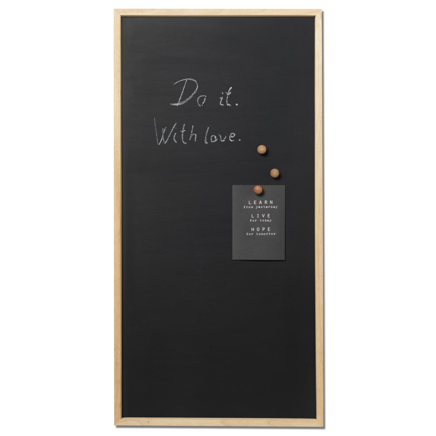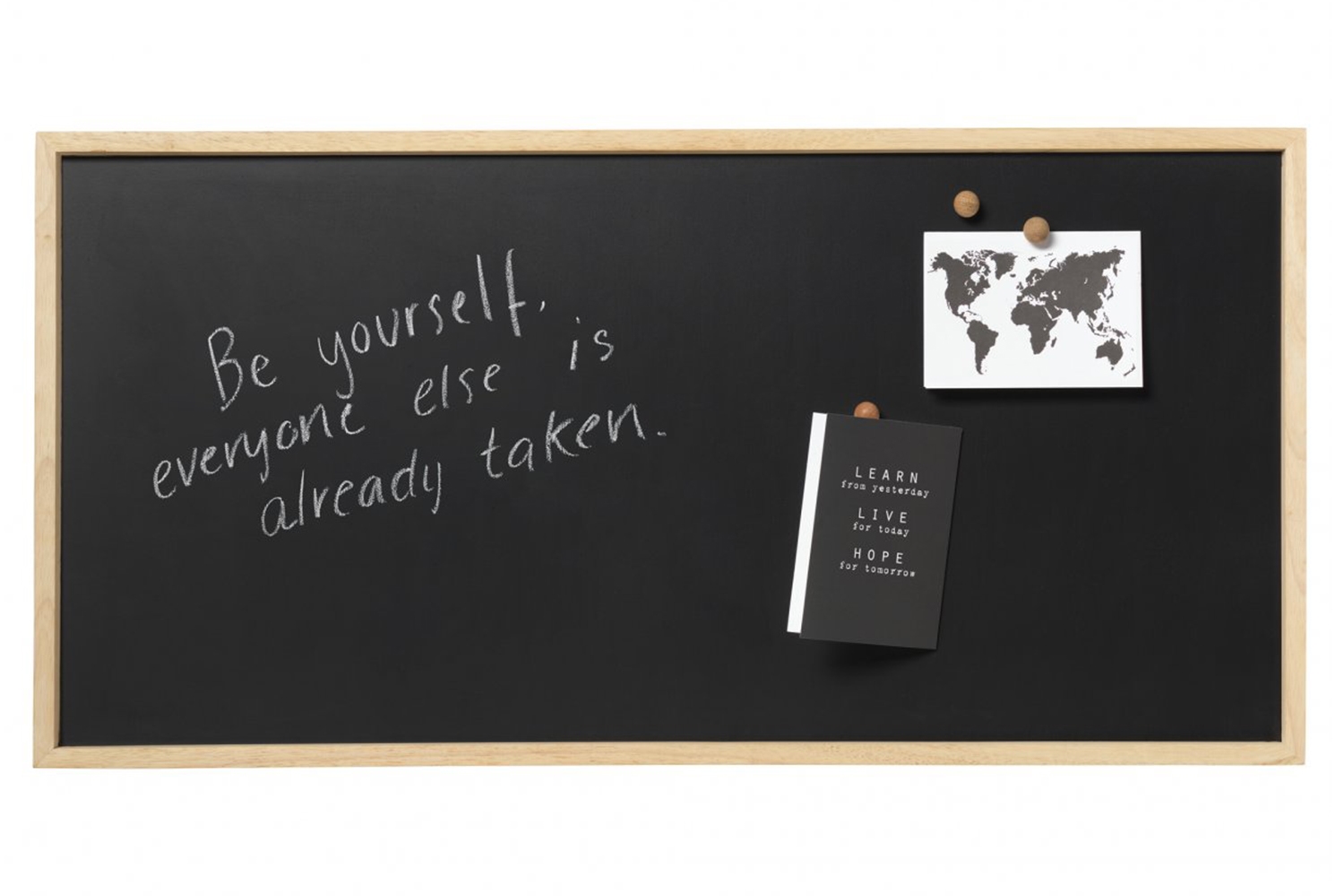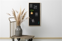Skrives på med vanlig kritt eller kritt markers. Du kan henge dine ting opp på tavlen med den inkluderte super sterke magnet i eiketre look.