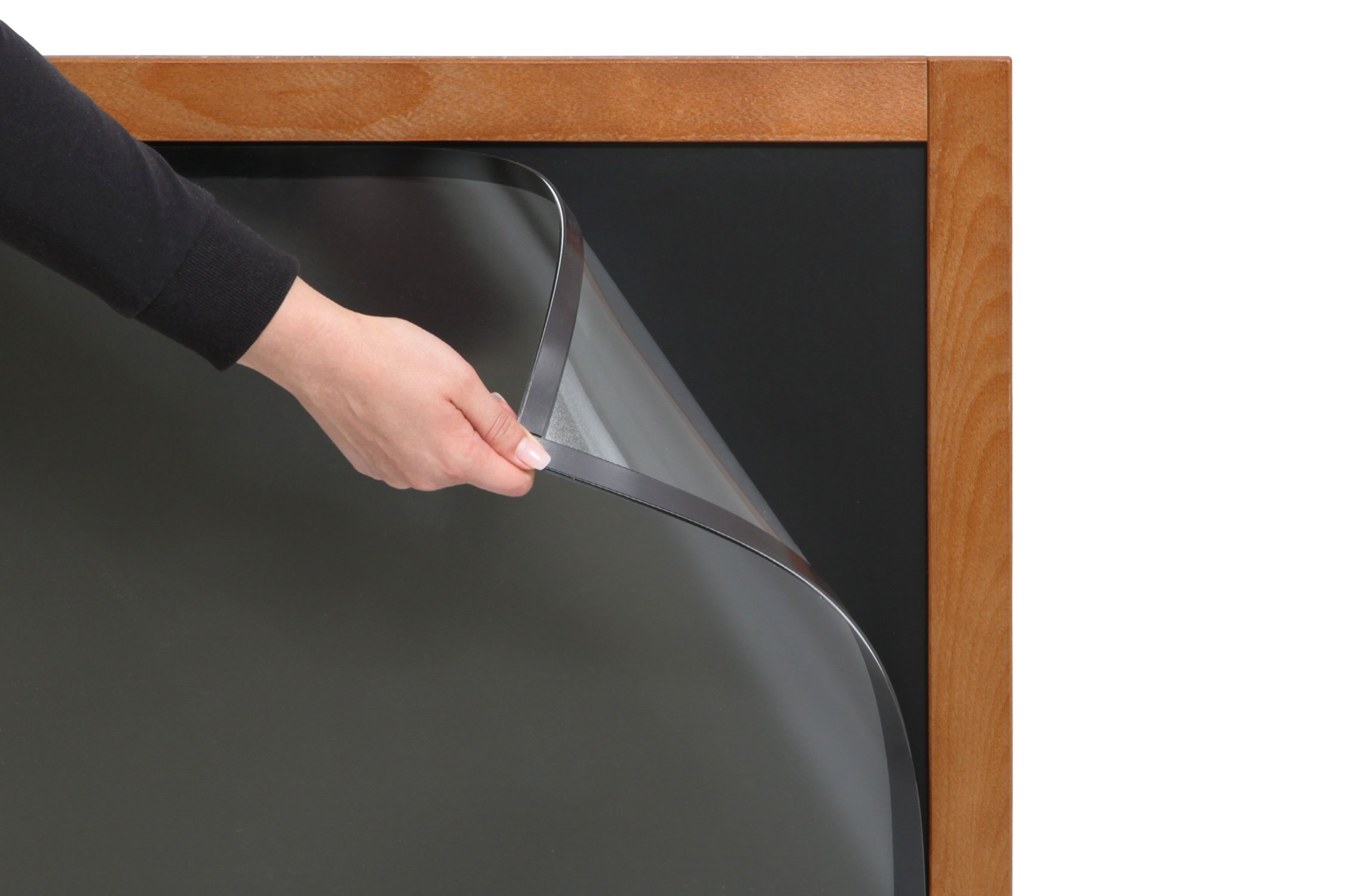 Luxus magnetisk krittavle / plakatramme i lakkert bøketre med magnetisk bakplate og antireflex frontplate.