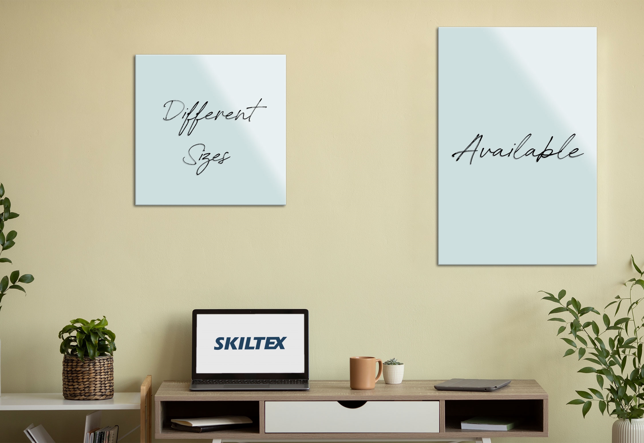 Stilren glasstavle laget av herdet glass med magnetisk overflate, for sikker bruk hjemme eller på kontoret. Tavlens tettsittende og diskrete design sørger for at den sitter helt inntil veggen.