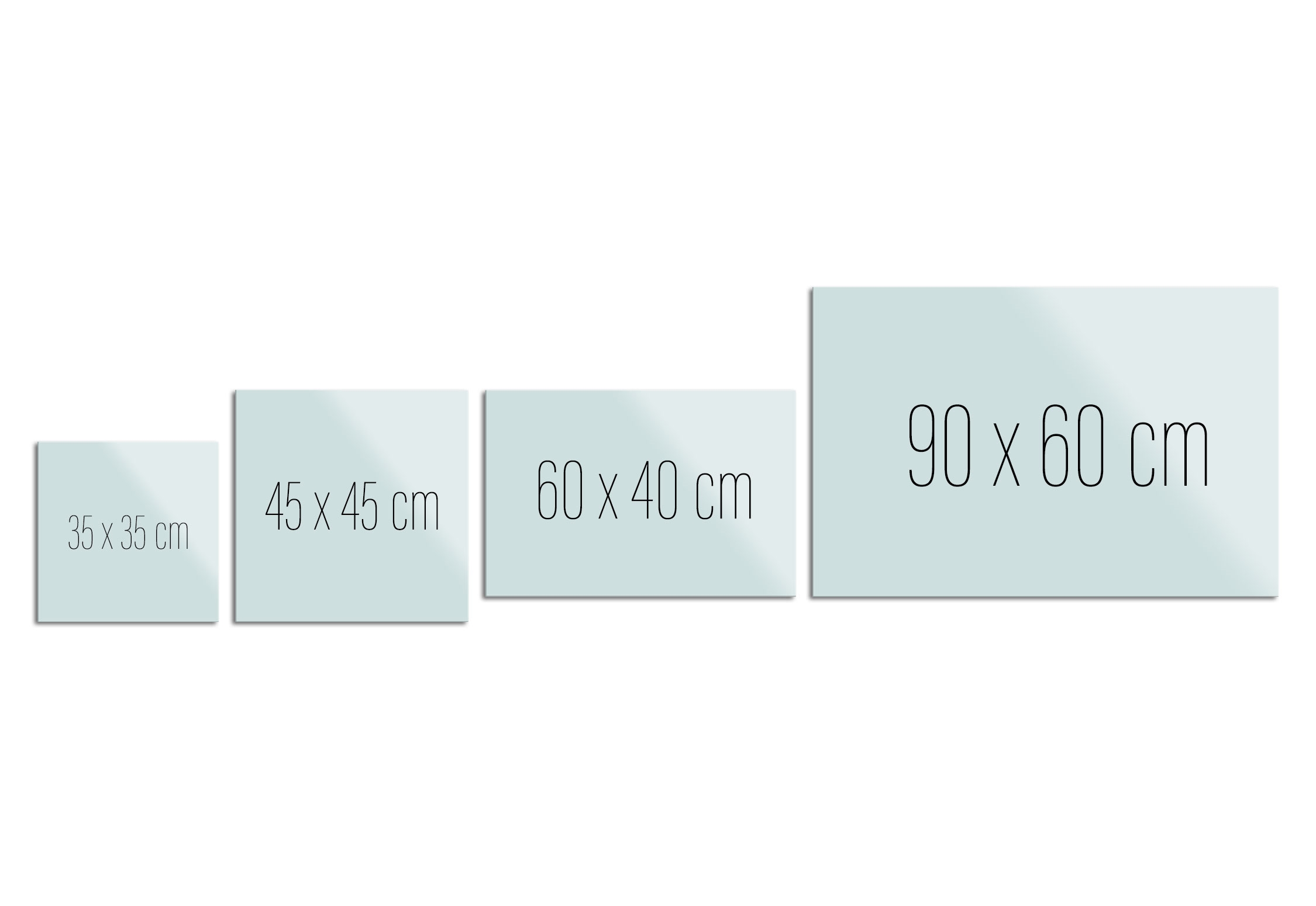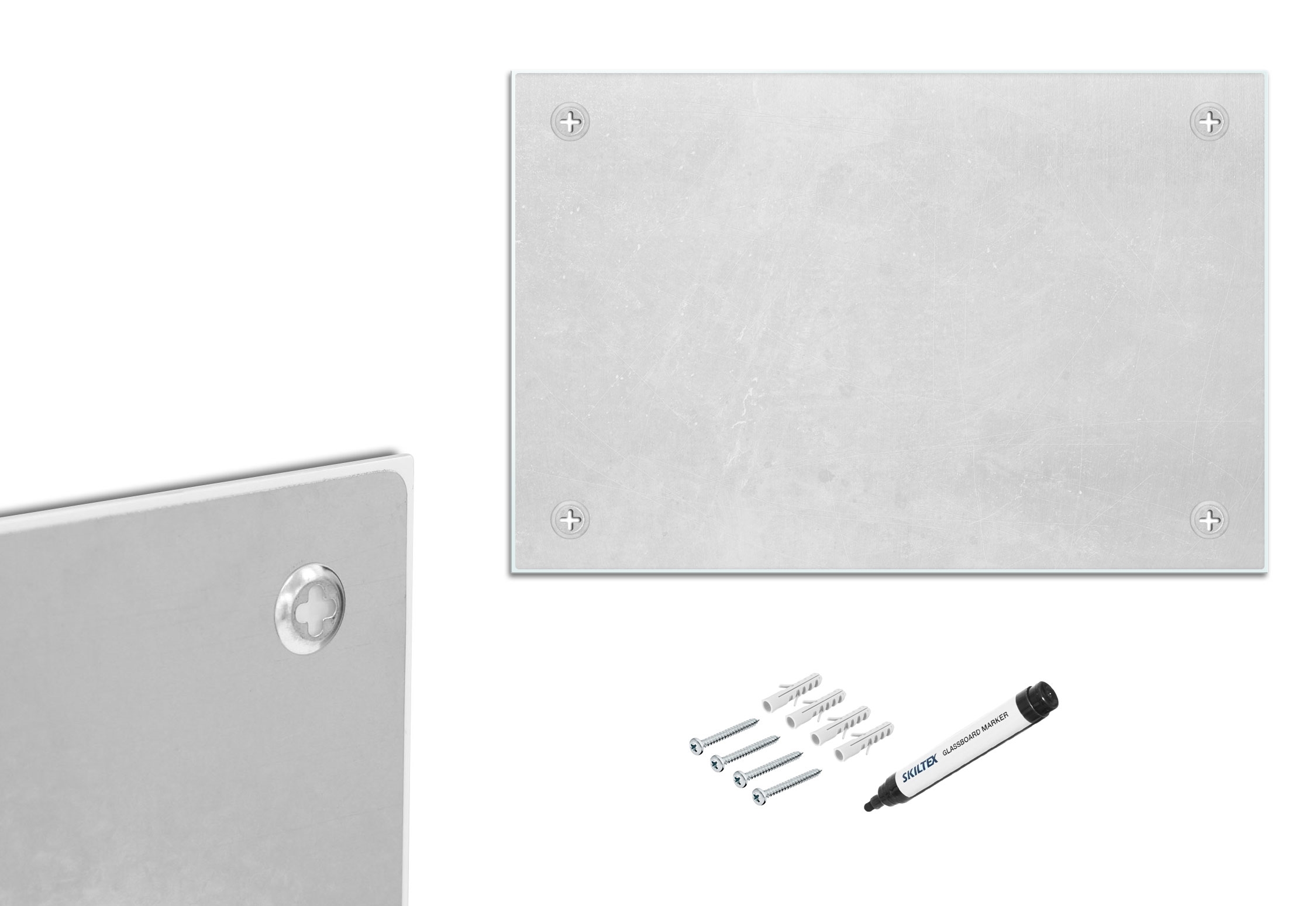 Baksiden har 4 monteringshull, ett i hver hjørne, som gir muligheten for å henge opp glassplaten både i høy- og bredformat. Leveres komplett med skruer for montering og svart markørpen.