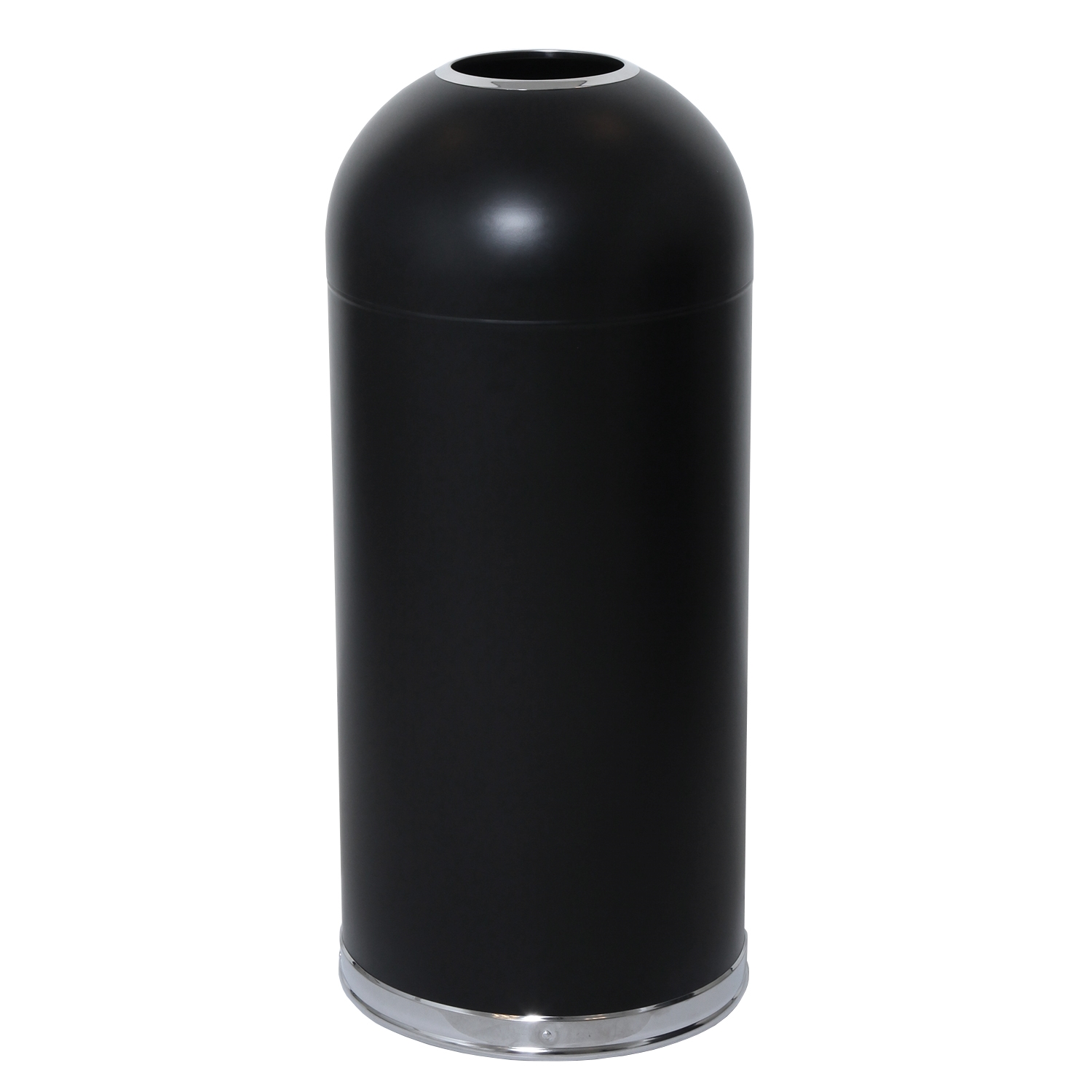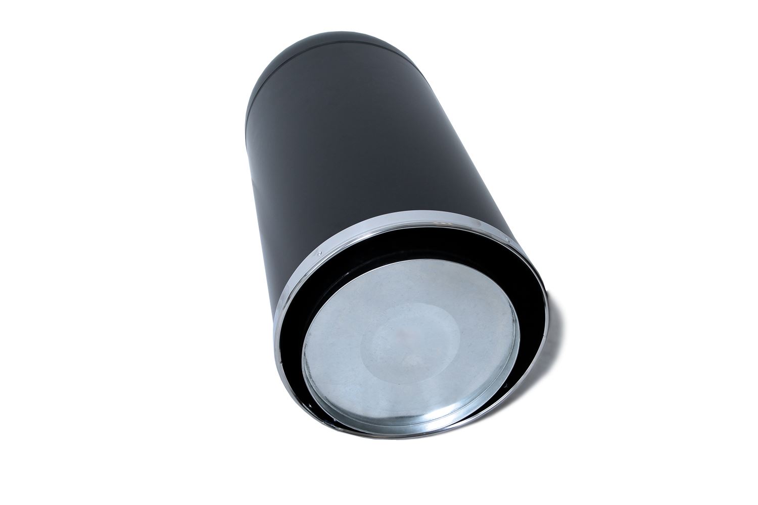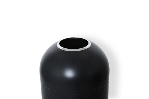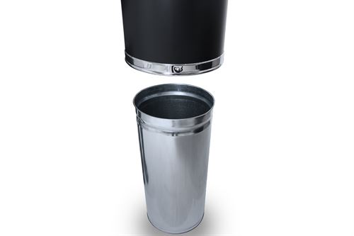 Stilfull søppelbøtte i matt svart pulverlakkert metall, åpen topp og rustfri galvanisert innvendig bøtte.