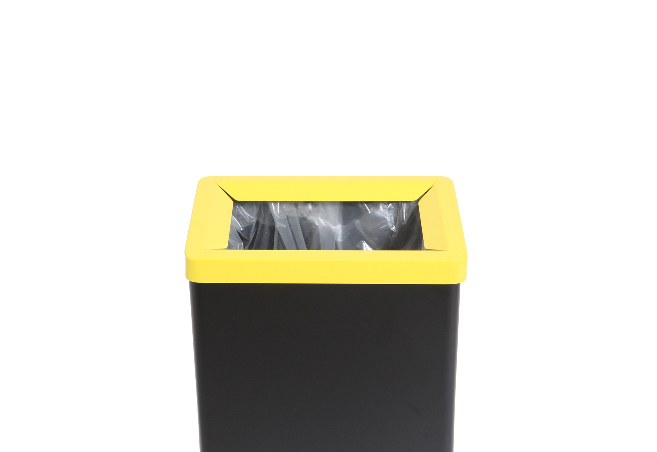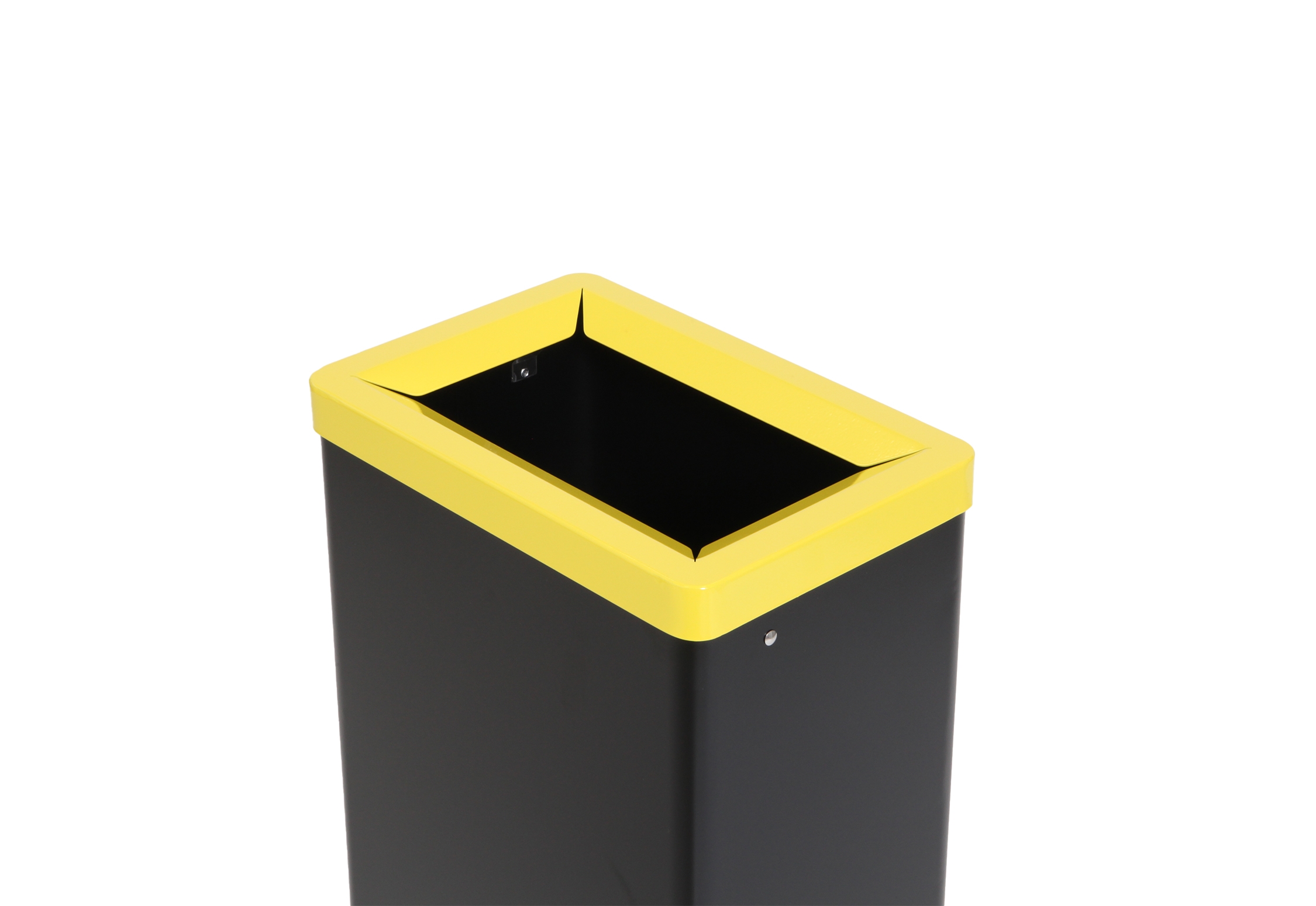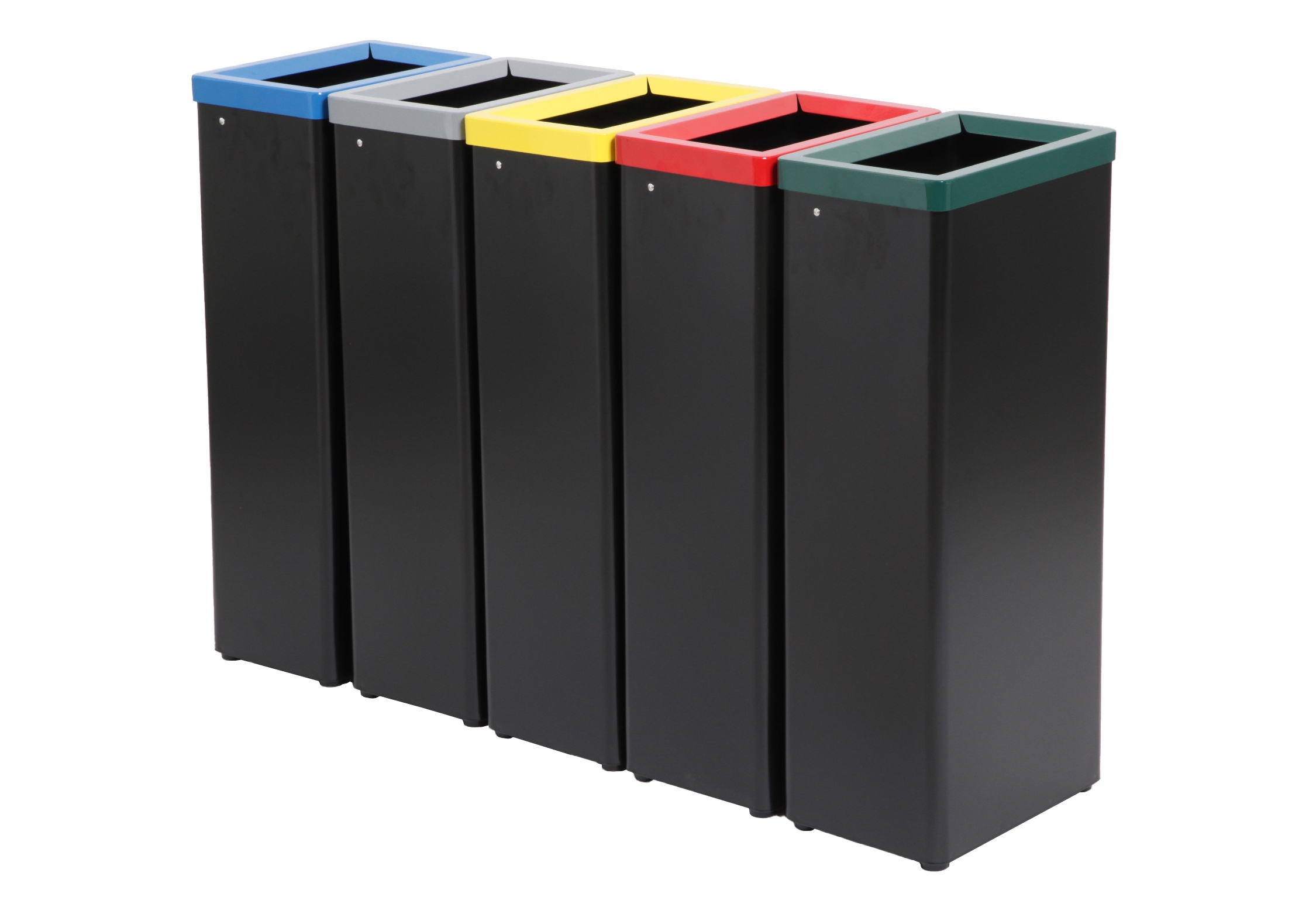 Modulær svart pulverlakkert stålgjenvinningsbeholder med farget åpning/topp for både innendørs og utendørs bruk.
