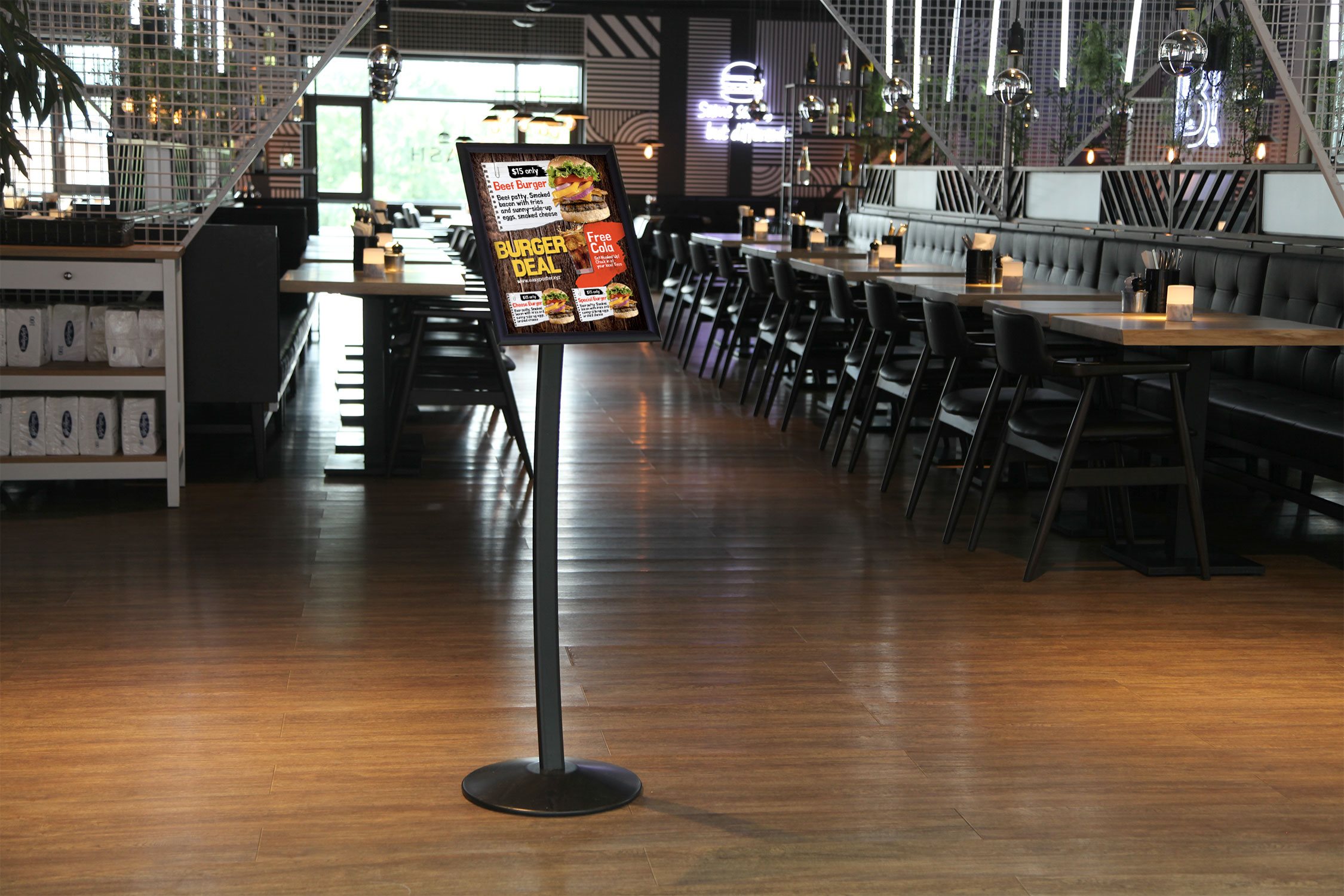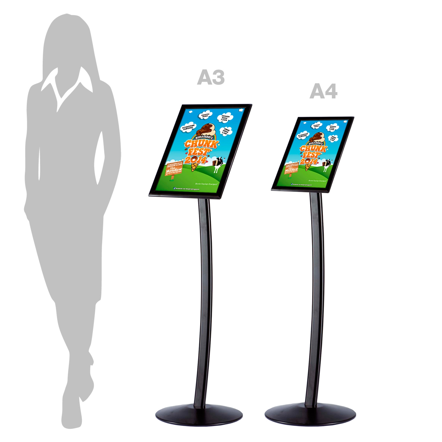 Frittstående, sorte displaystativer til A4-og A3-plakater