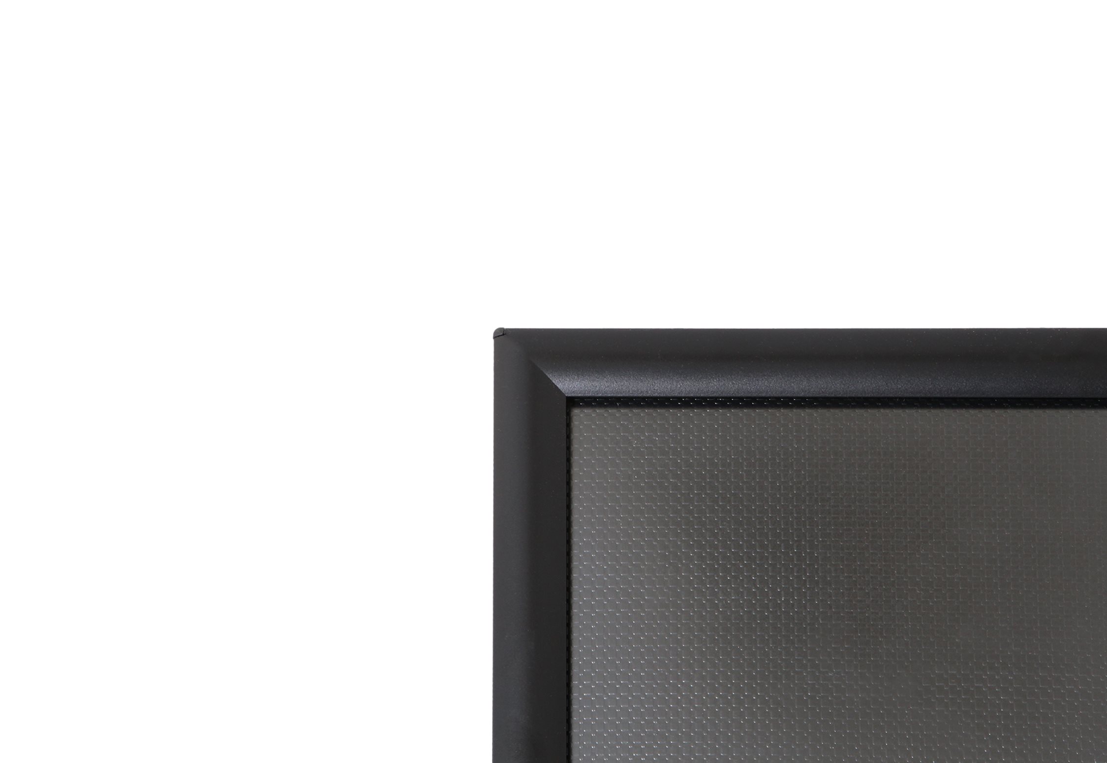 Montert med en sorteloksert klikkramme med 25 mm profil og APET-frontplate med antirefleks som gjør utskiftning av budskapet enkelt.