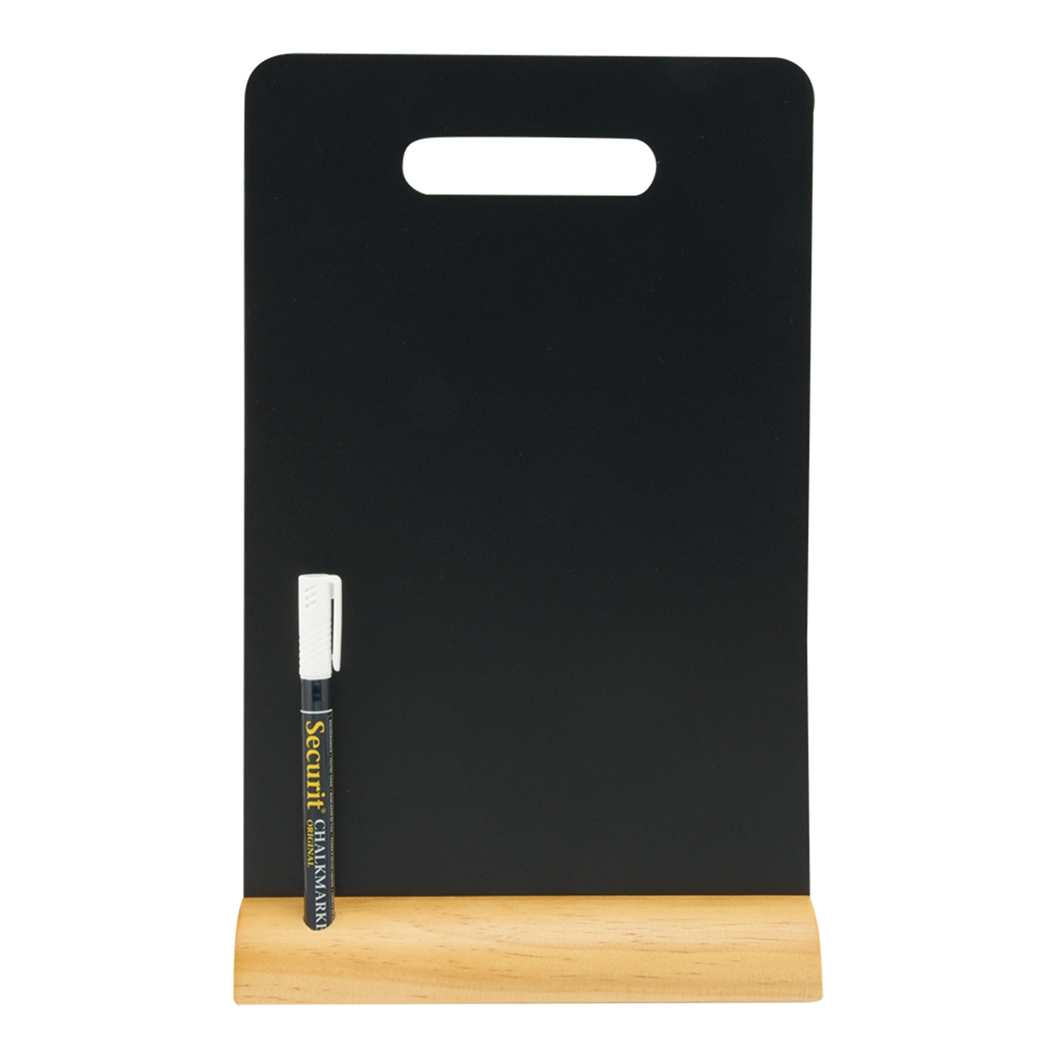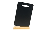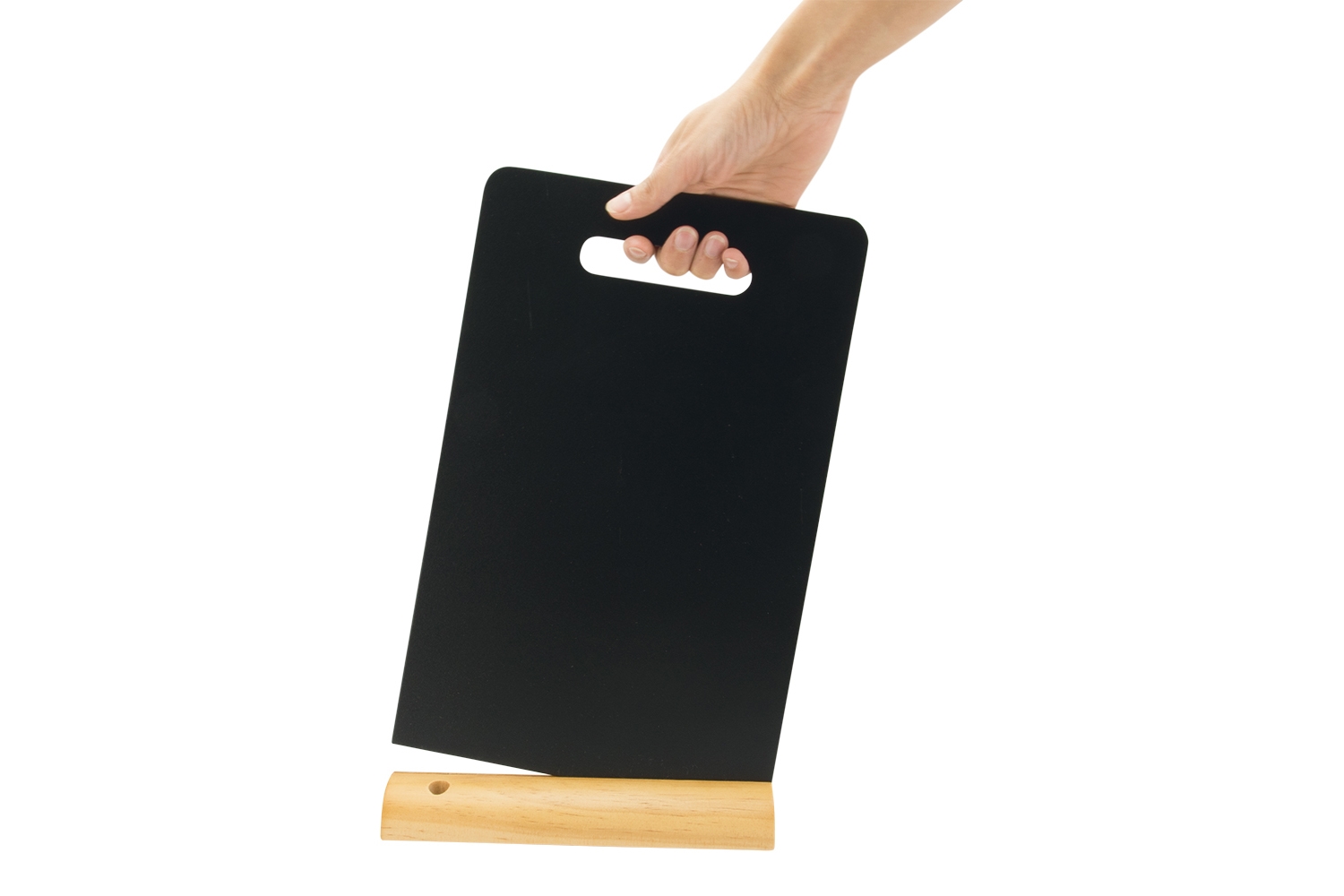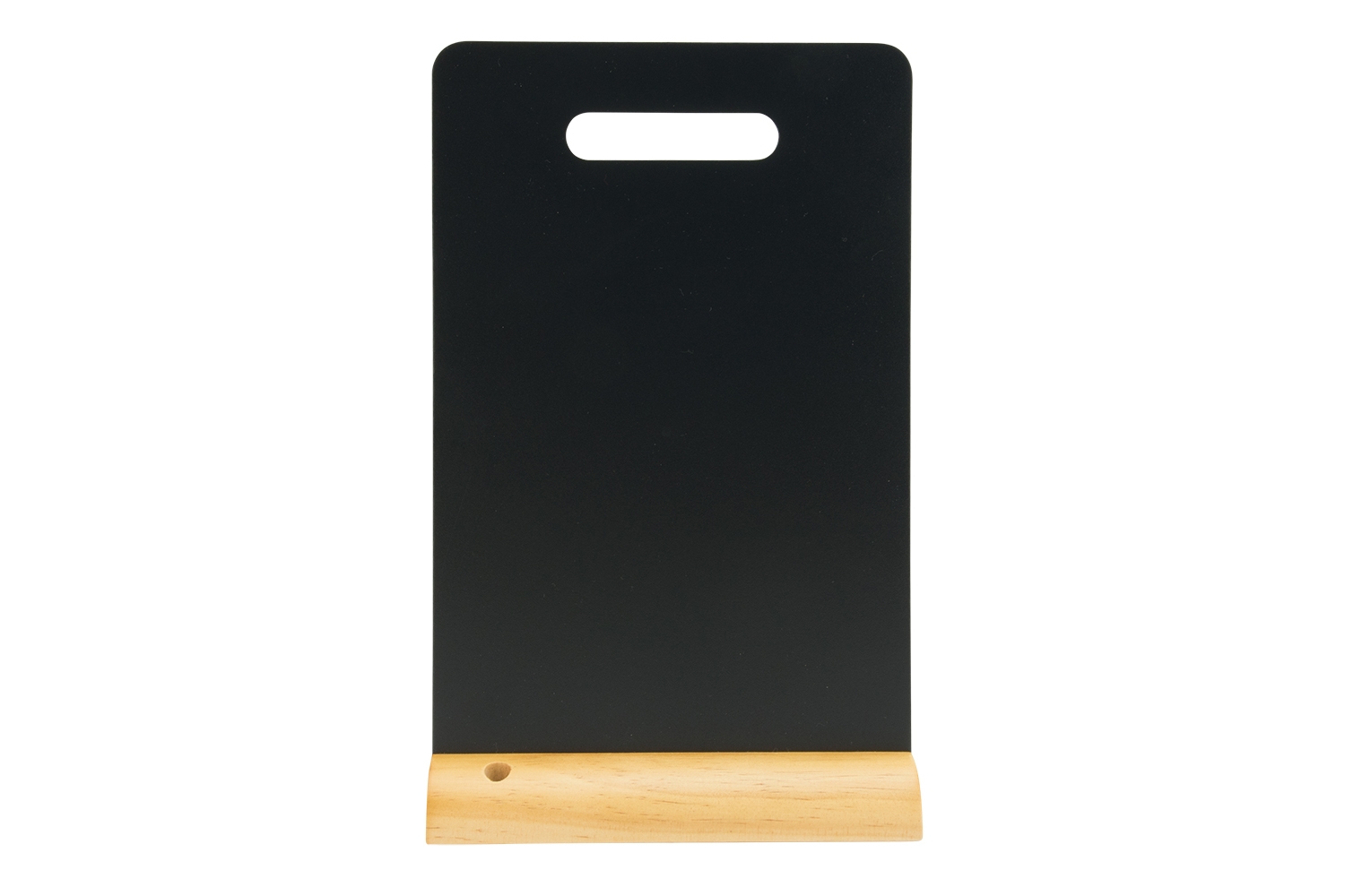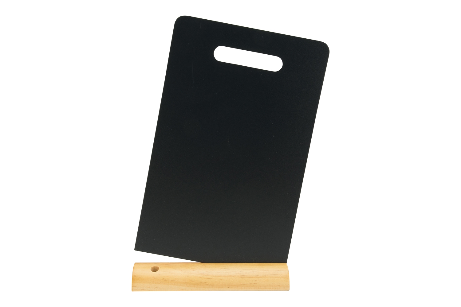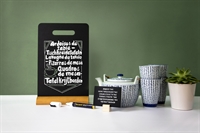 Meny kritt-tavle til bord med smart håndtag og flott fot i teaktre. Begge sider av tavlen kan skrives på med kritt og kritt marker penne. Det følger også med en hvit kritt marker penn (med 1-2mm) som kan settes i trefotens holder.