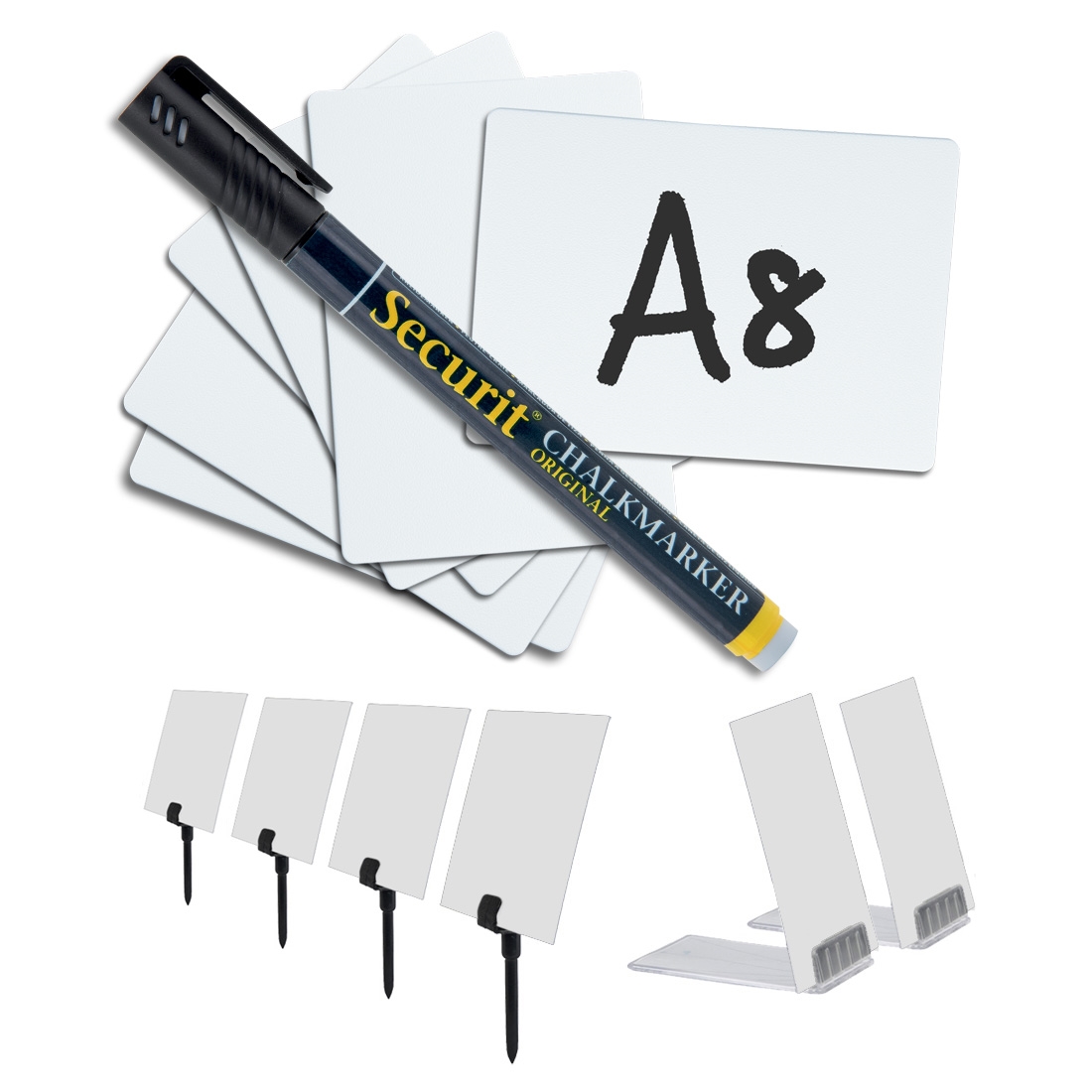 • 20 stk A8 (5,2 x 7,4 cm) hvide tavleskilte.