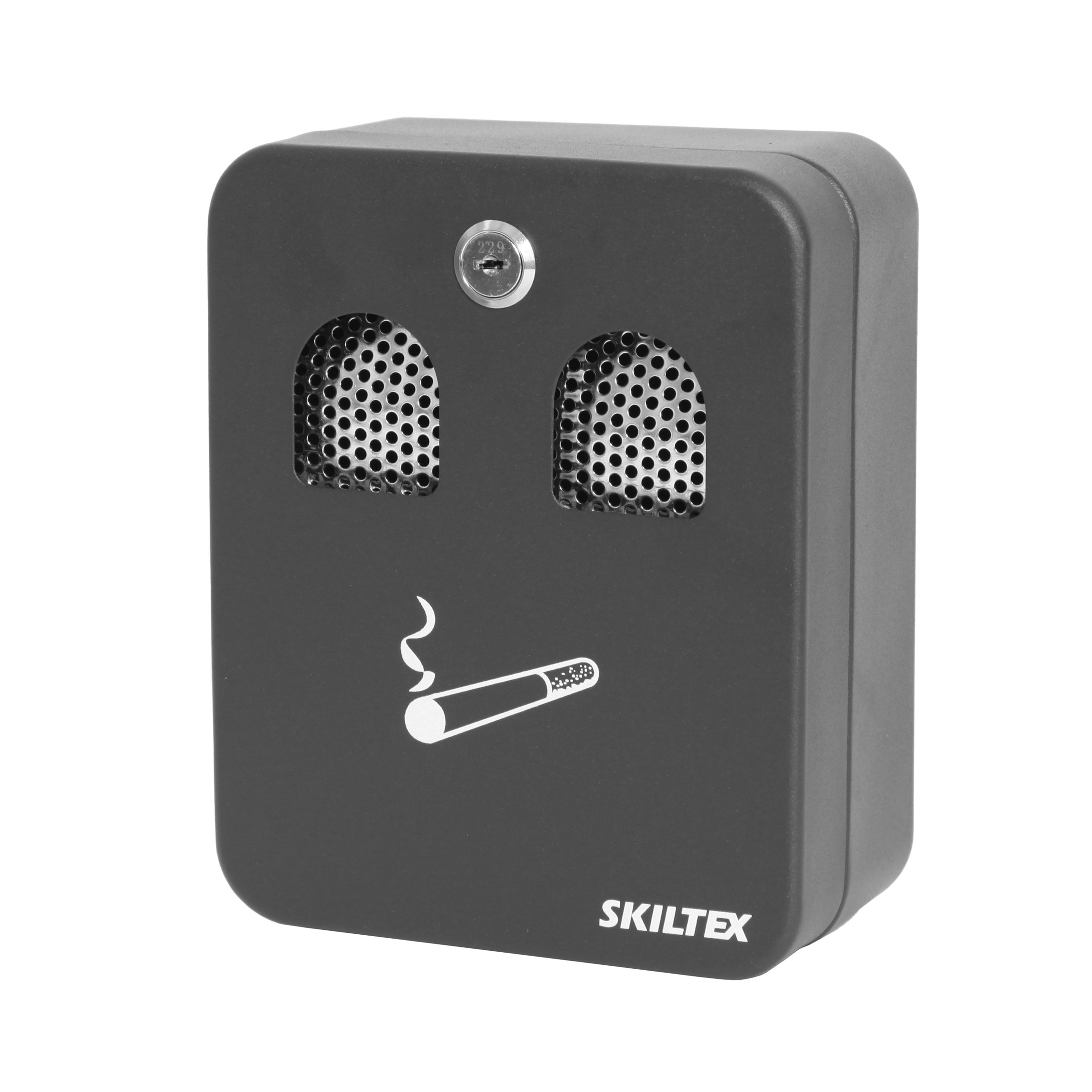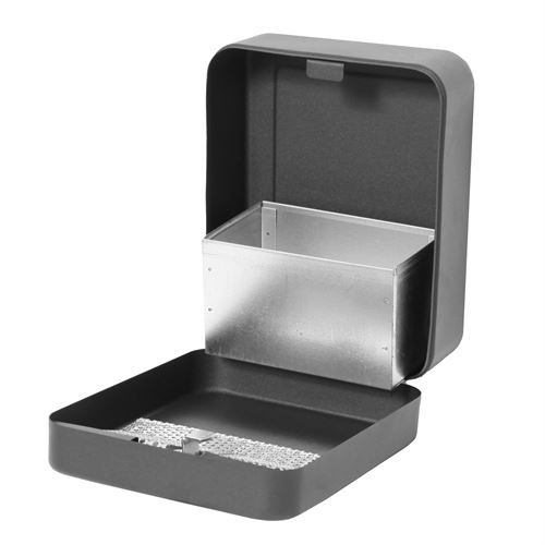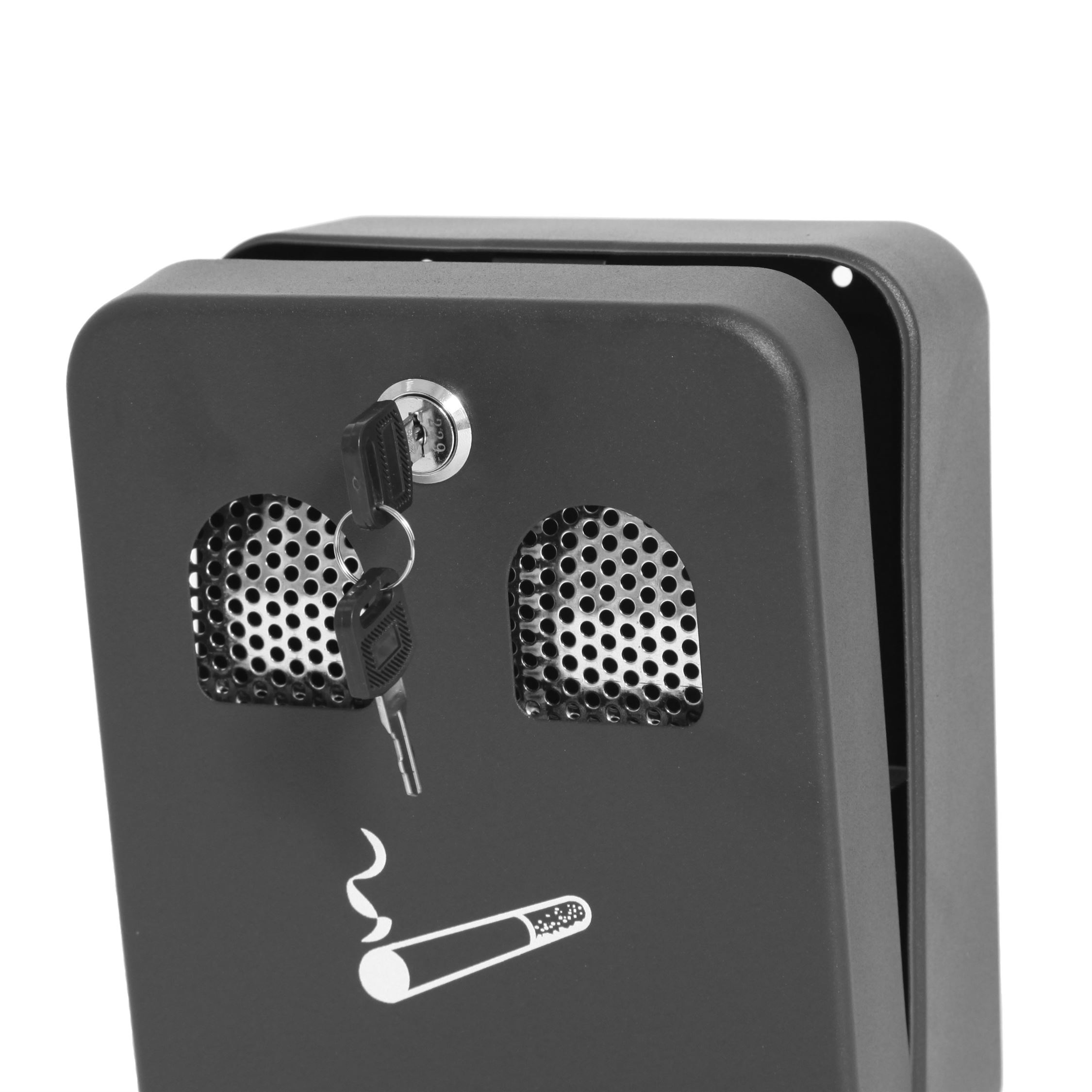 Fronten kan låses, har en liten sigarett symbol på og er utstyrt med 2 huller med nett for enkel tømming av sigarettsneiper.