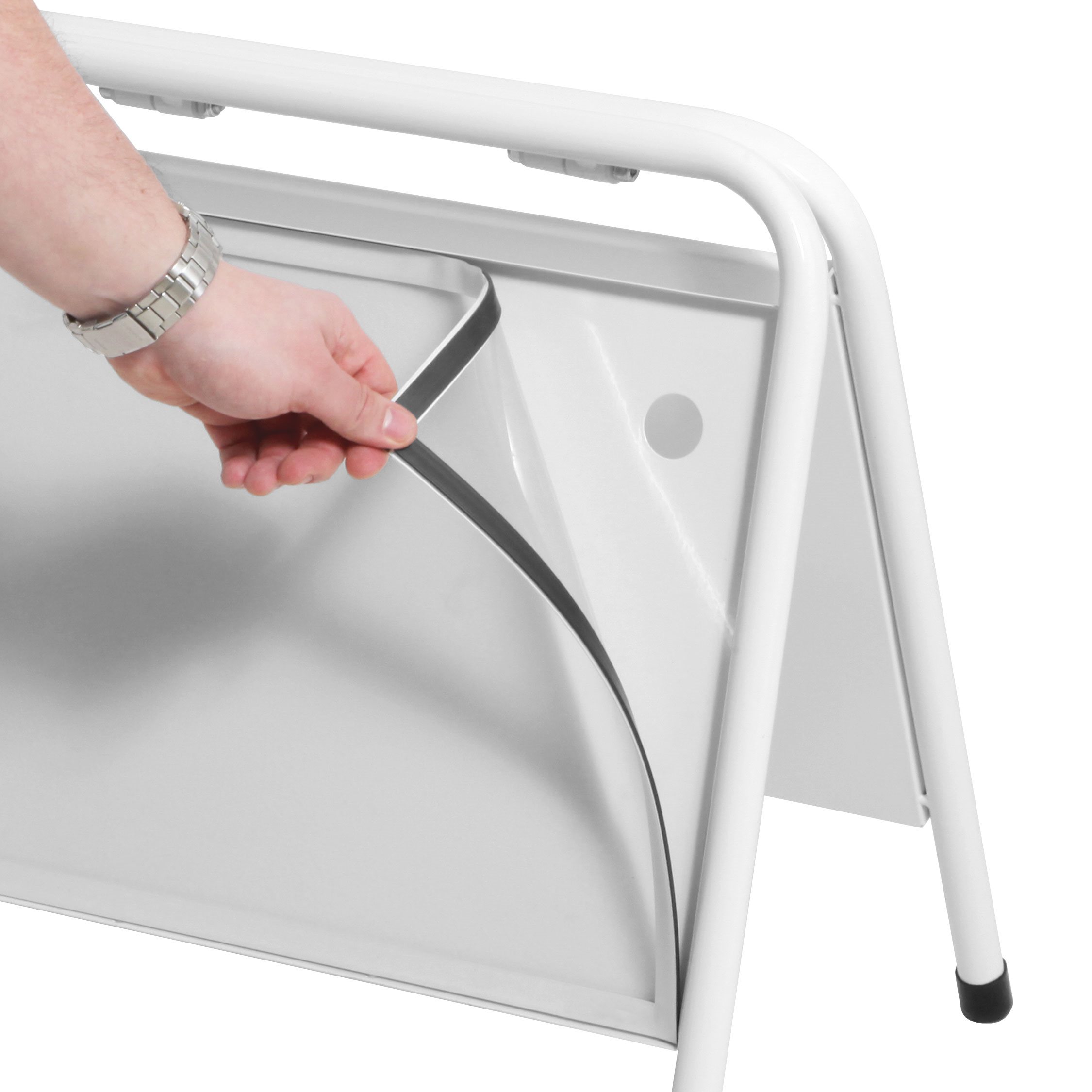 MiniSign finnes i svart og hvitt og leveres med magnetiske svarte frontplater som beskytter plakatene dine mot vind og vær.