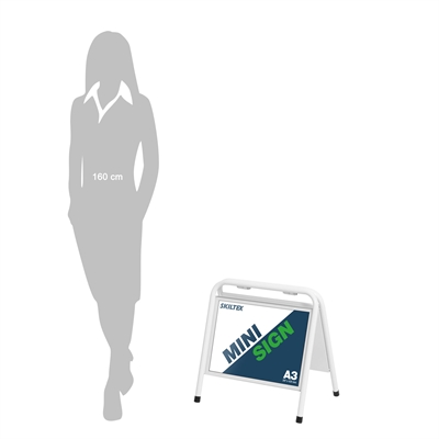 MiniSign A3 gateskilt er meget fleksibel og ideell til bruk som et midlertidig skilt som enkelt kan flyttes rundt. Disse skiltene blir f.eks. brukt av eiendomsmeglere, frisører, mm.