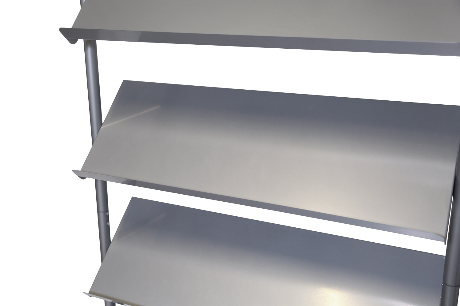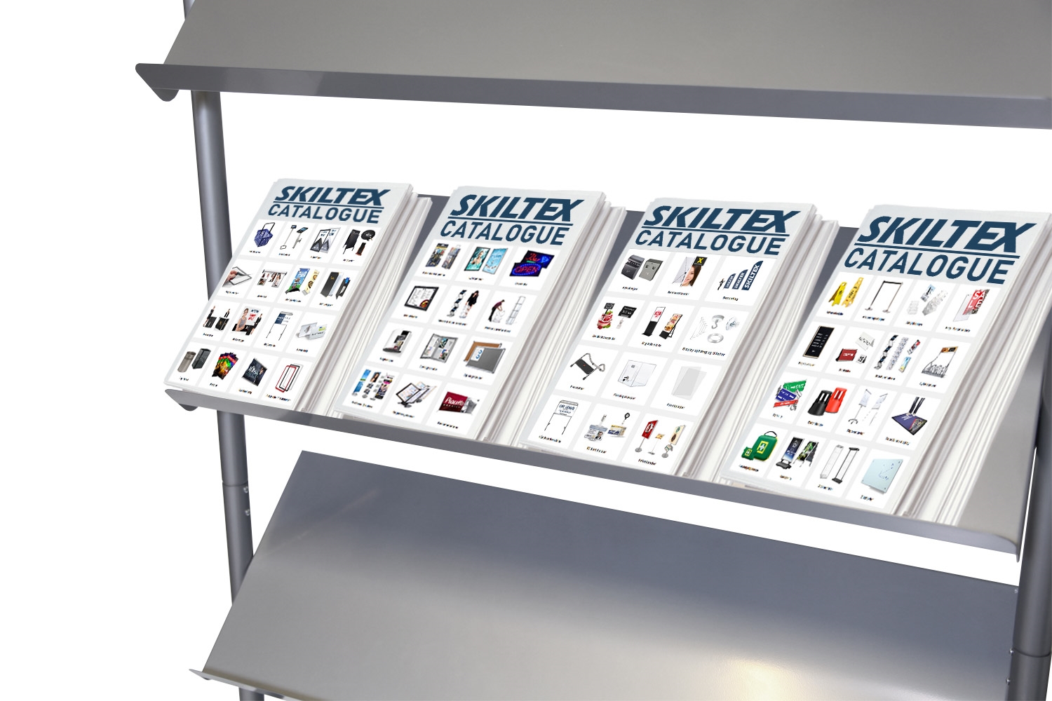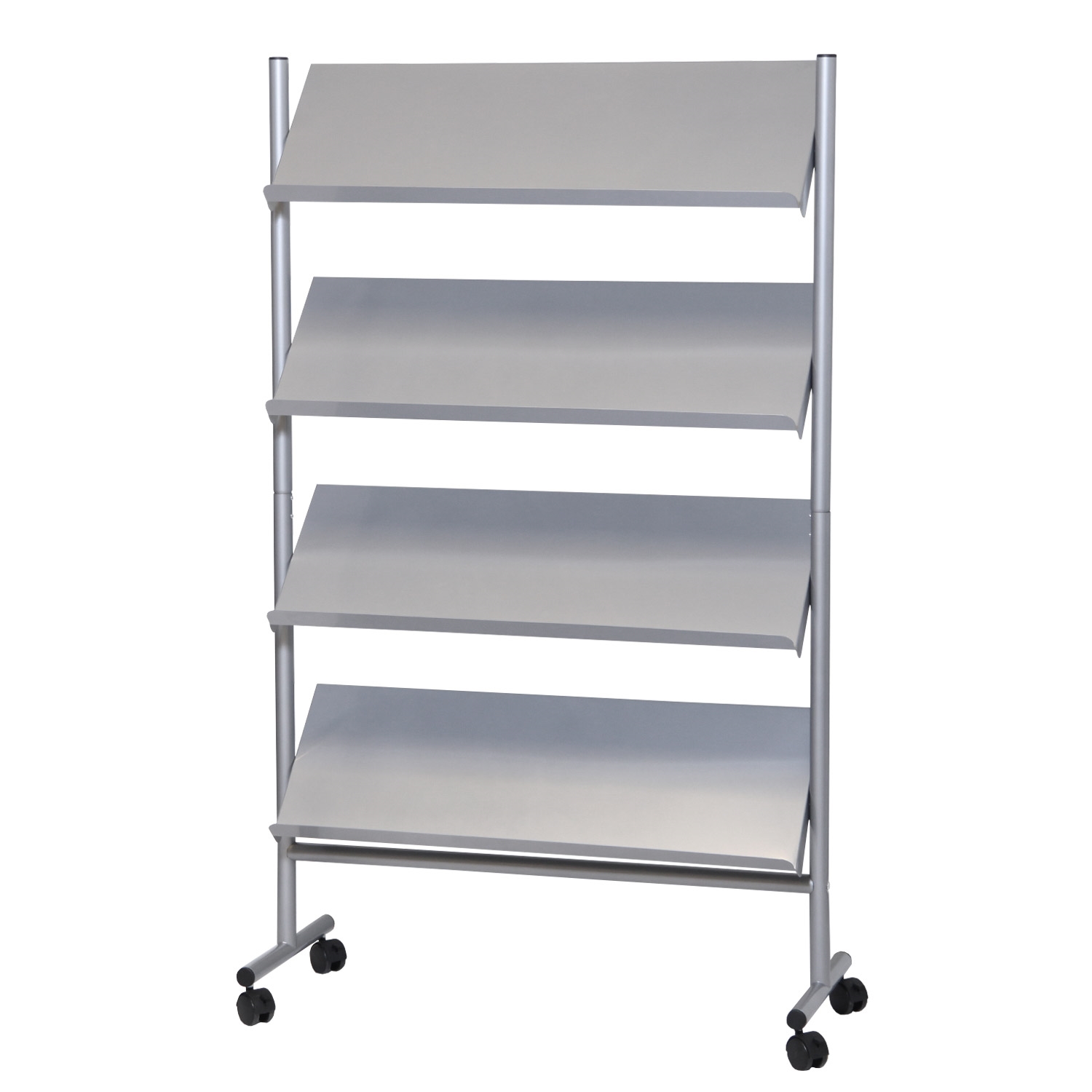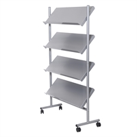 Stativets hyller er 4 cm i dubden og har plass til 16 stable av brosjyrer, magasiner osv.