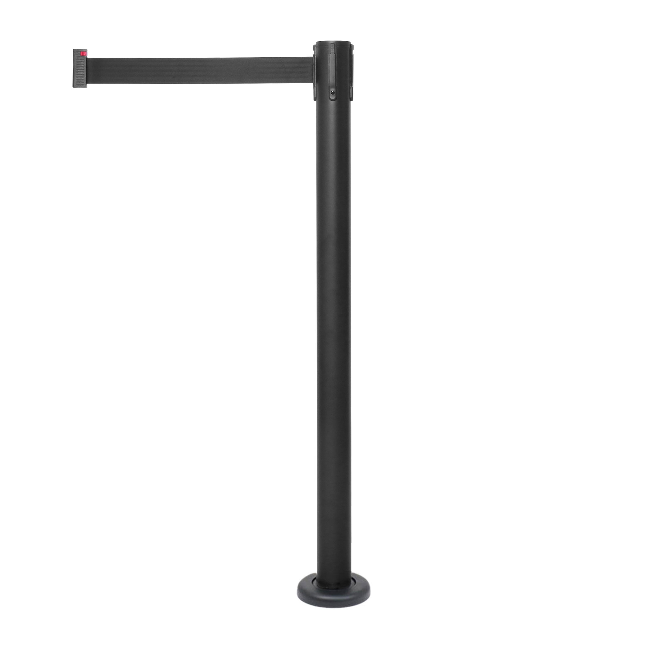 Profesjonell svart avspærringsstolpe, laget av galvanisert stål med integrert, boltmonterbar fot - designet for fast montering på gulvet. En dekkeplate for foten følger med – som gir et pent og ferdig utseende etter montering.