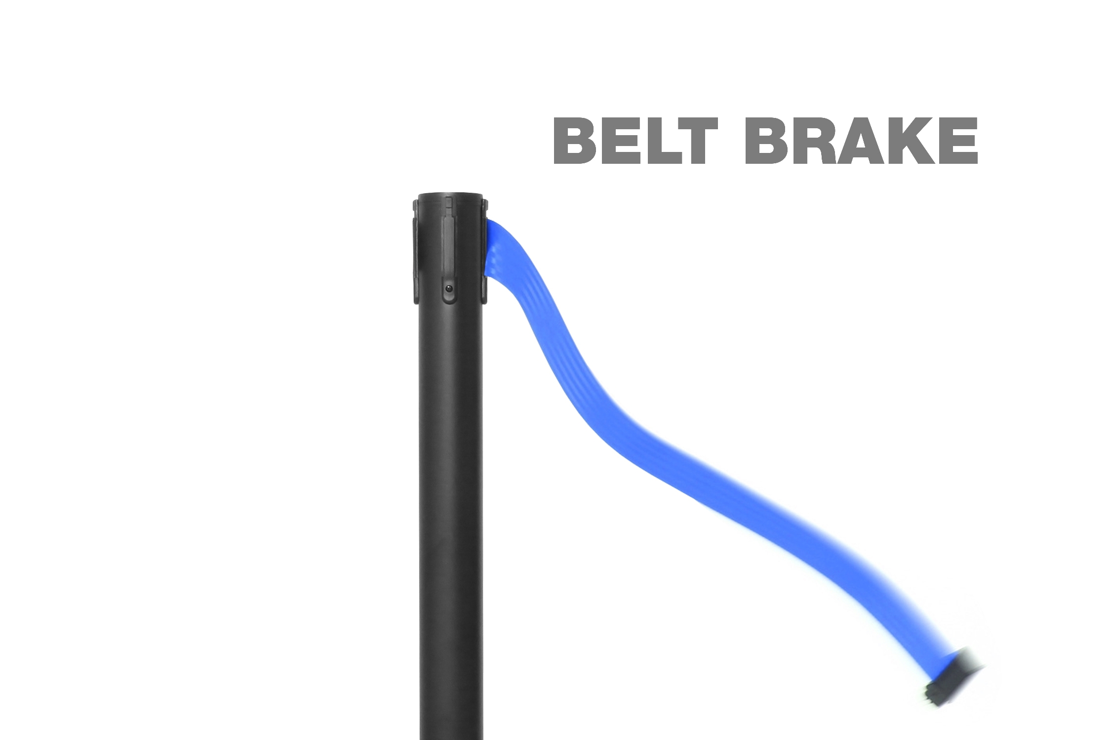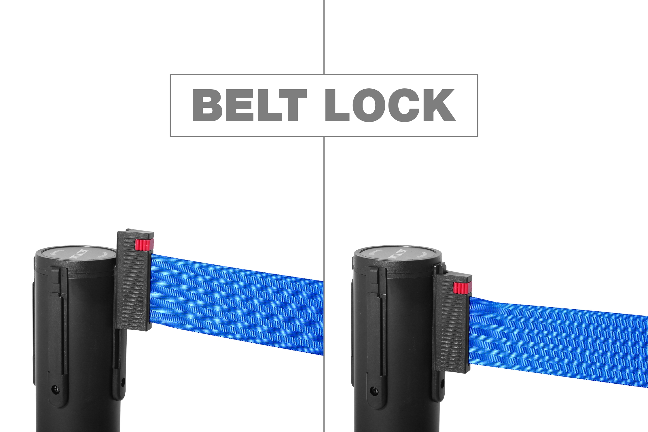 Stolpen er også utstyrt med en sikkerhetsreturfunksjon, slik at båndet ikke ruller ukontrollert tilbake når det slippes. I stedet trekkes det sakte og sikkert tilbake i spolen.
