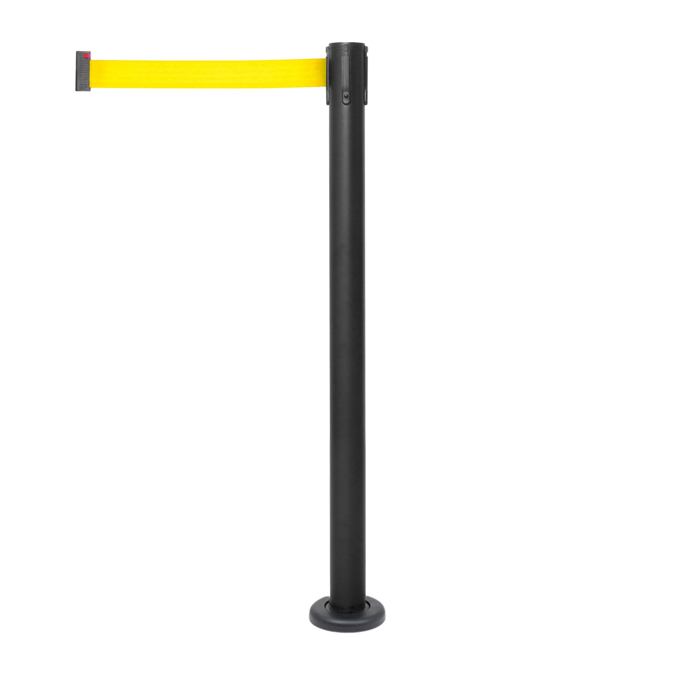 Profesjonell svart avspærringsstolpe, laget av galvanisert stål med integrert, boltmonterbar fot - designet for fast montering på gulvet. En dekkeplate for foten følger med – som gir et pent og ferdig utseende etter montering.