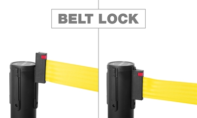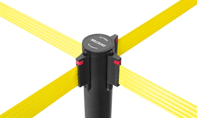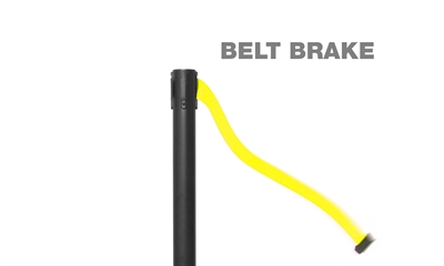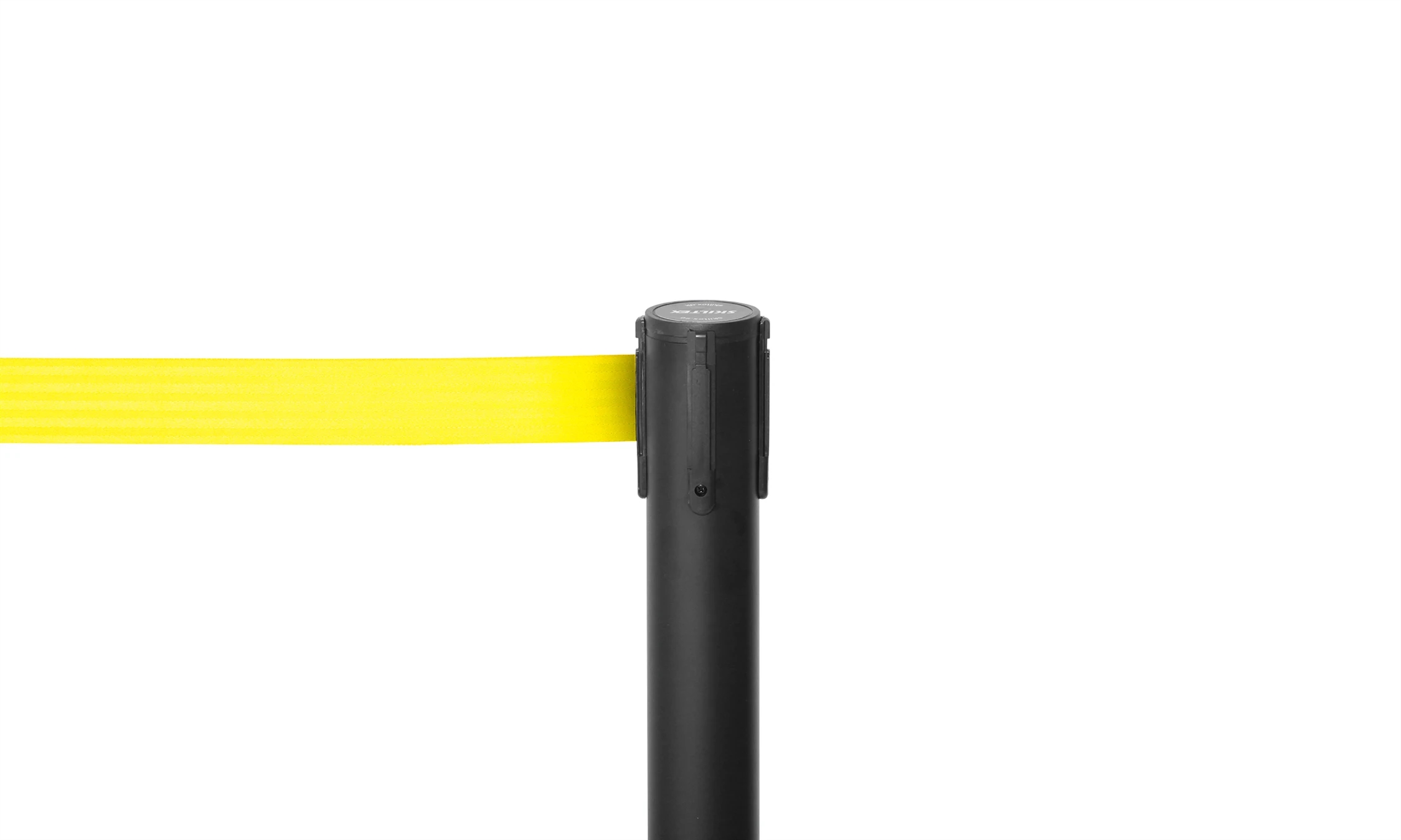 Stolpen er også utstyrt med en sikkerhetsreturfunksjon, slik at båndet ikke ruller ukontrollert tilbake når det slippes. I stedet trekkes det sakte og sikkert tilbake i spolen.
