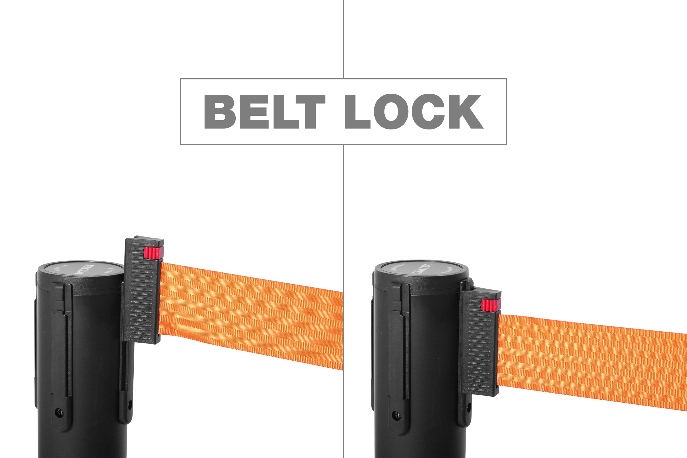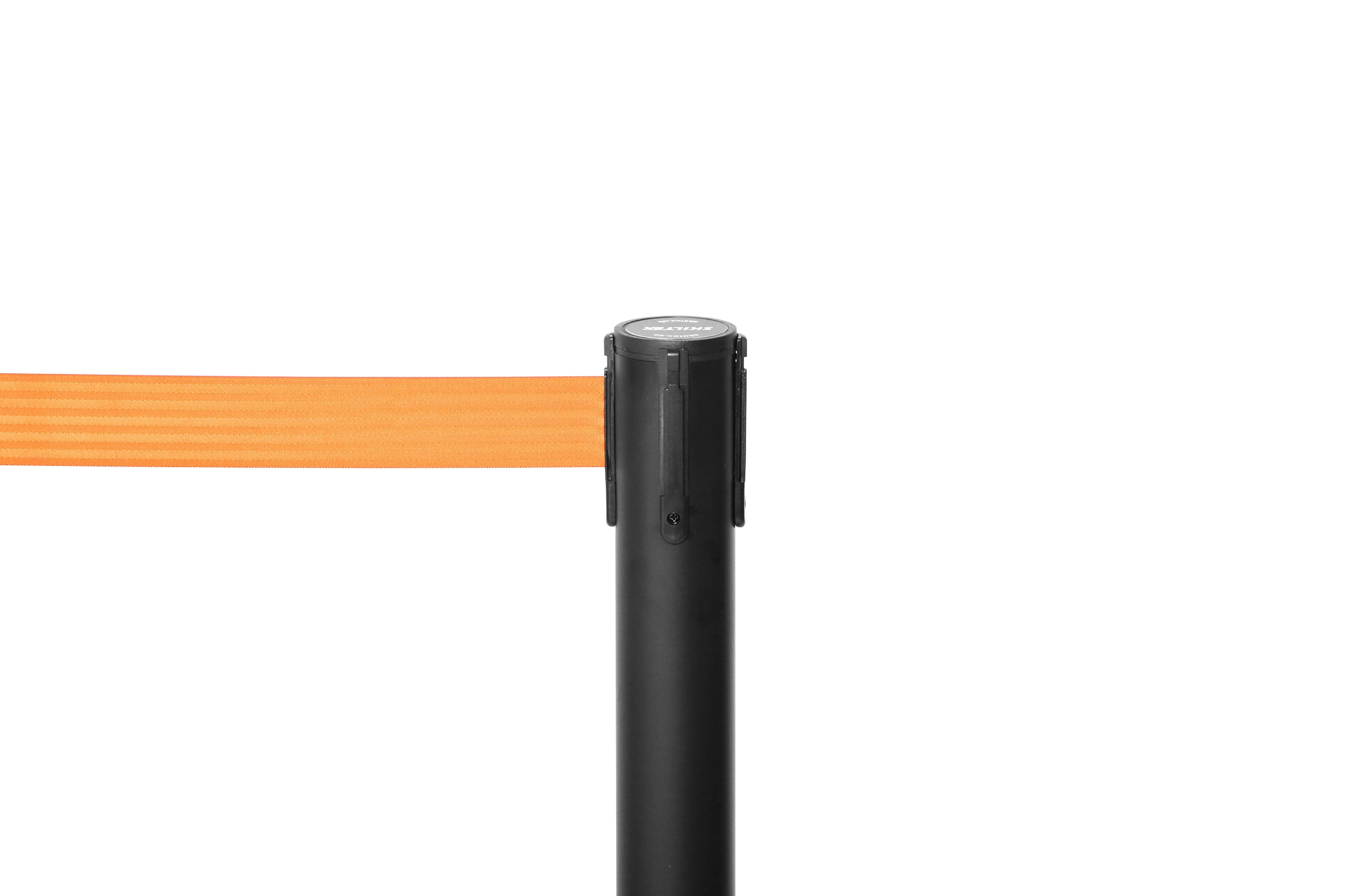 Stolpen er også utstyrt med en sikkerhetsreturfunksjon, slik at båndet ikke ruller ukontrollert tilbake når det slippes. I stedet trekkes det sakte og sikkert tilbake i spolen.
