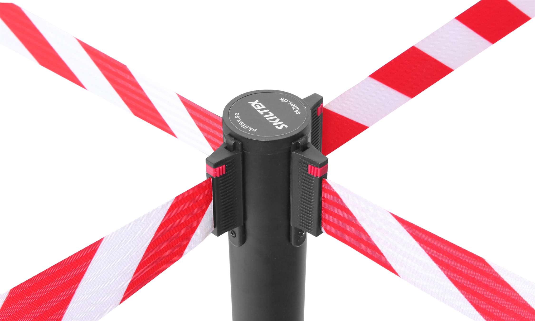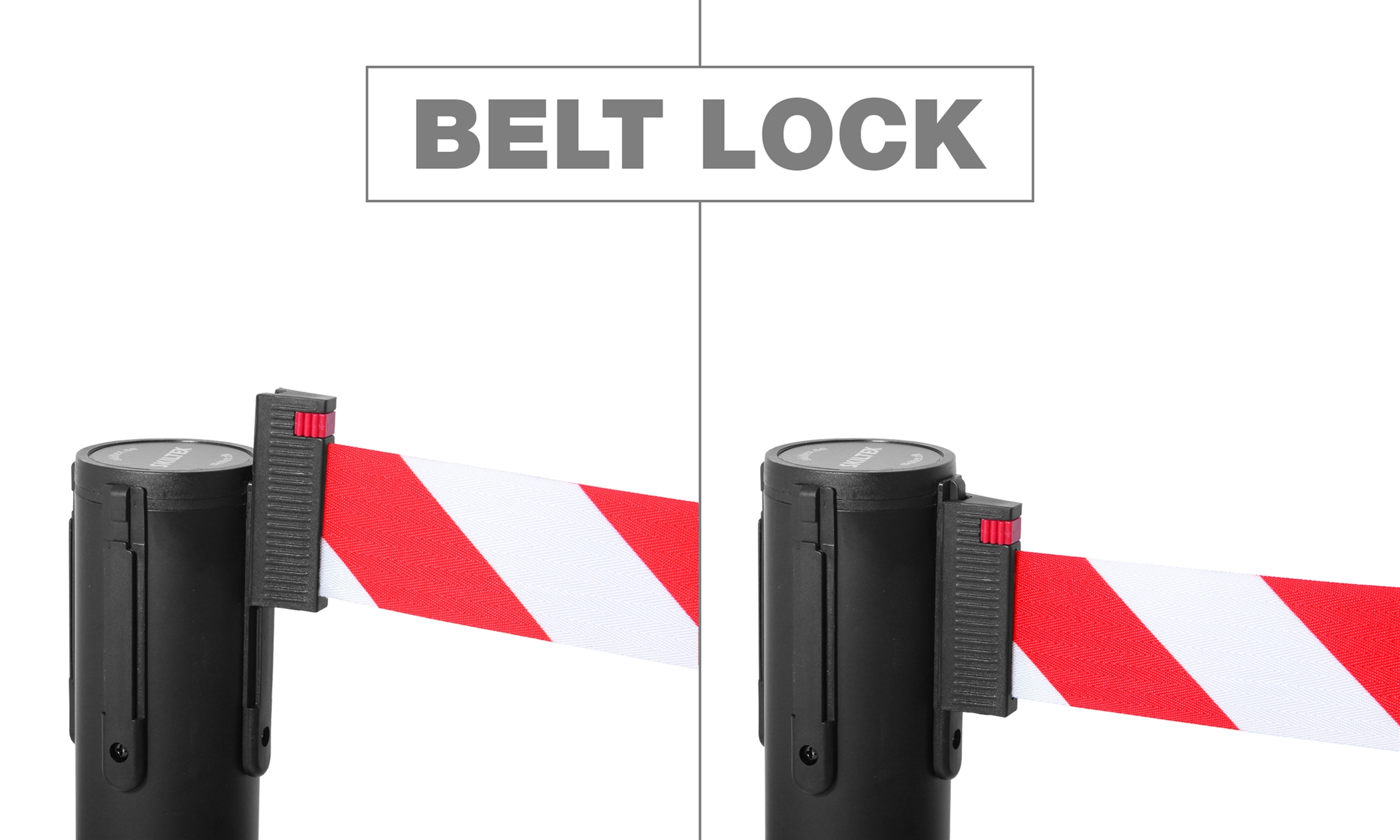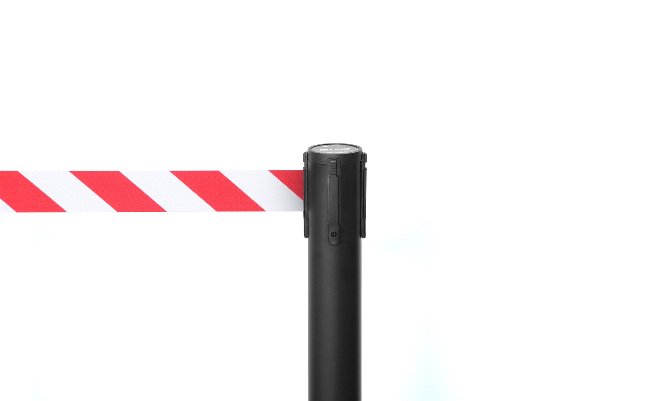 Stolpen er også utstyrt med en sikkerhetsreturfunksjon, slik at båndet ikke ruller ukontrollert tilbake når det slippes. I stedet trekkes det sakte og sikkert tilbake i spolen.