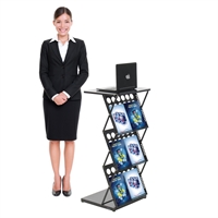 MovePro counter er perfekt som et litet bord til laptop eller lignende og virker samtidig som brosjyrestativ til brosjyrer i A4 størrelse