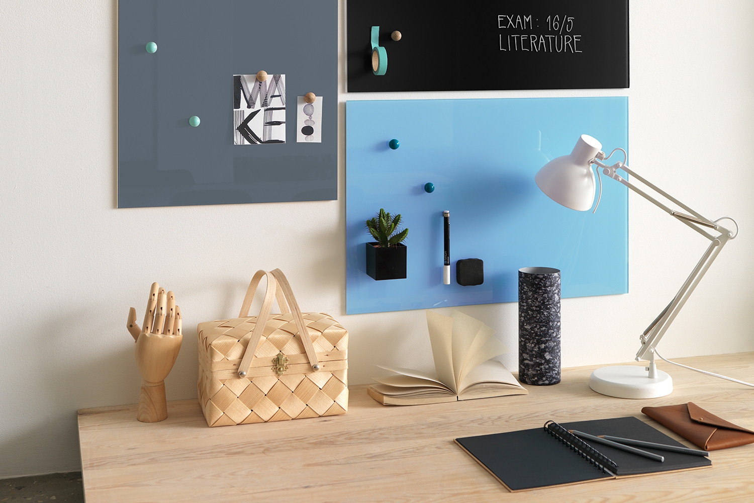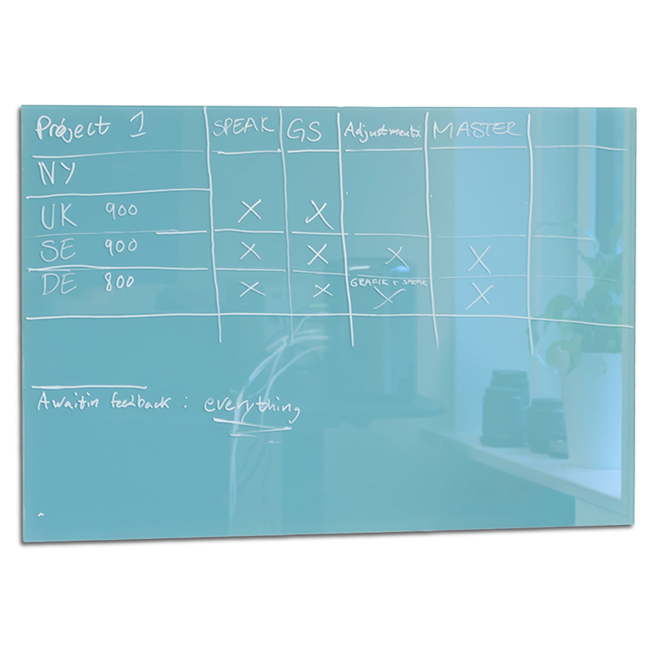 En praktisk glasstavle med skrivevennlig overflate. Du kan sette papirer, kalender notater, bilder, og andre dekorasjoner på tavlen med magneter, via glasstavlens magnetiske bakplate. Glassoverflaten kan skrives på med glasstavle markers, vanlige whiteboard markers og selv kritt markers.