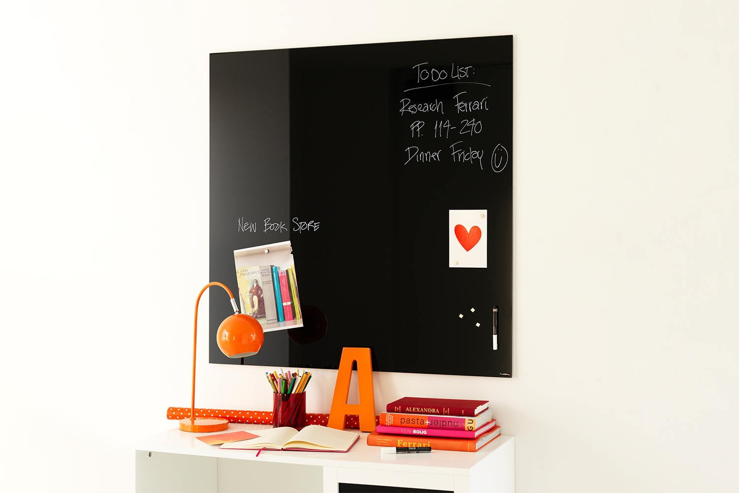 Svart kvadratisk glasstavle til vegg, magnetisk overflate. 100 x 100 cm. Med masser av plass til både tekst, tegning, og oppheng! Tavlens overflate er laget av herdet glass. Glasset er skrivevennlig, og velegnet til bruk med glasstavle markers, vanlige whiteboard markers, og til og med kritt markers. Når teksten er tørr, kan den enkelt viskes ut igen, bare bruk en tavlesvamp eller en tørr klut.