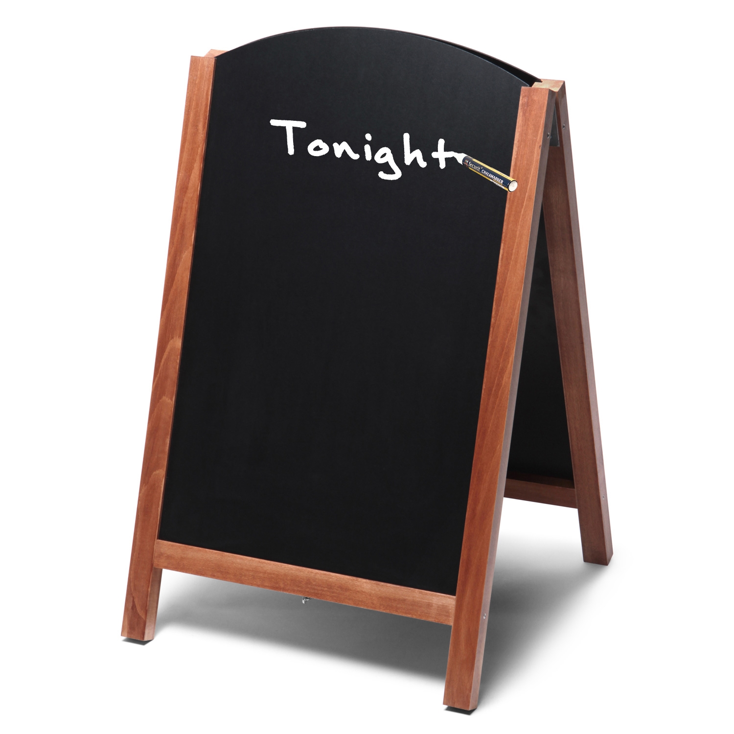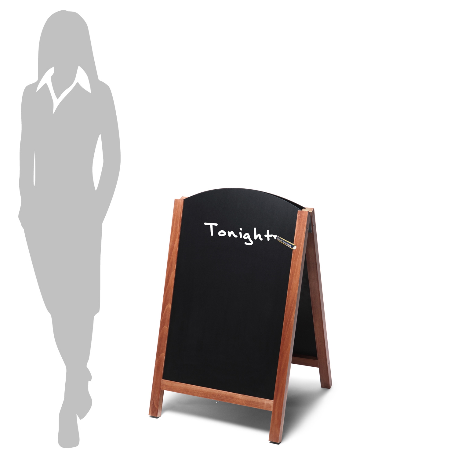Flott fortausskilt i lys brun beiset hardtre med tosidige høytrykkslaminerte tavler og elegant avrundet topp.