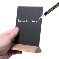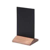 Menyholder med fleksibel, skrivbar dobbelsidig krittavle på solid lysebrun trefot til bord.