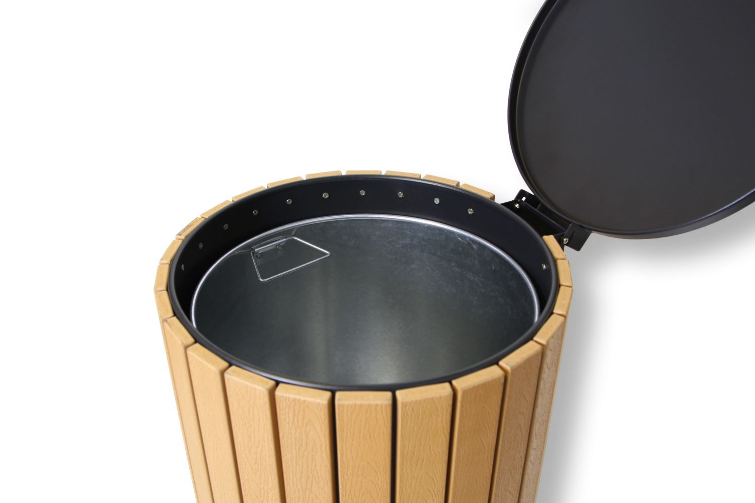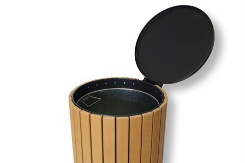 Rund 90 liter søppeldunk med sækkeholder og låg. Produceret i galvaniseret stål og hård plast. Er nem at vedligeholde og udstyret med indbygget robust sækkeholder.