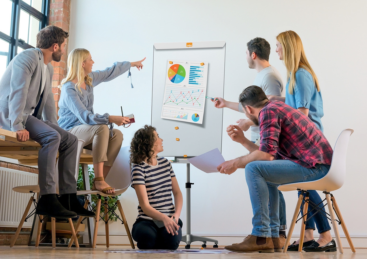 Uten papir kan flipovertavlen også brukes som en whiteboardtavle. Leveres med regulerbare kroker til blokk, en markerpenn og et set magneter.