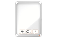 Værbestandig (IP34) Oppslagsskap til innen- og utendørs bruk med modern stilfull aluminiumsramme, hengslet låsbar luke i sikkerhedsglass og magnetisk skrivbar whiteboard overflate med 10 års garanti.