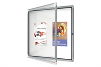 Værbestandig (IP34) Oppslagsskap til innen- og utendørs bruk med modern stilfull aluminiumsramme, hengslet låsbar luke i sikkerhedsglass og magnetisk skrivbar whiteboard overflate med 10 års garanti.