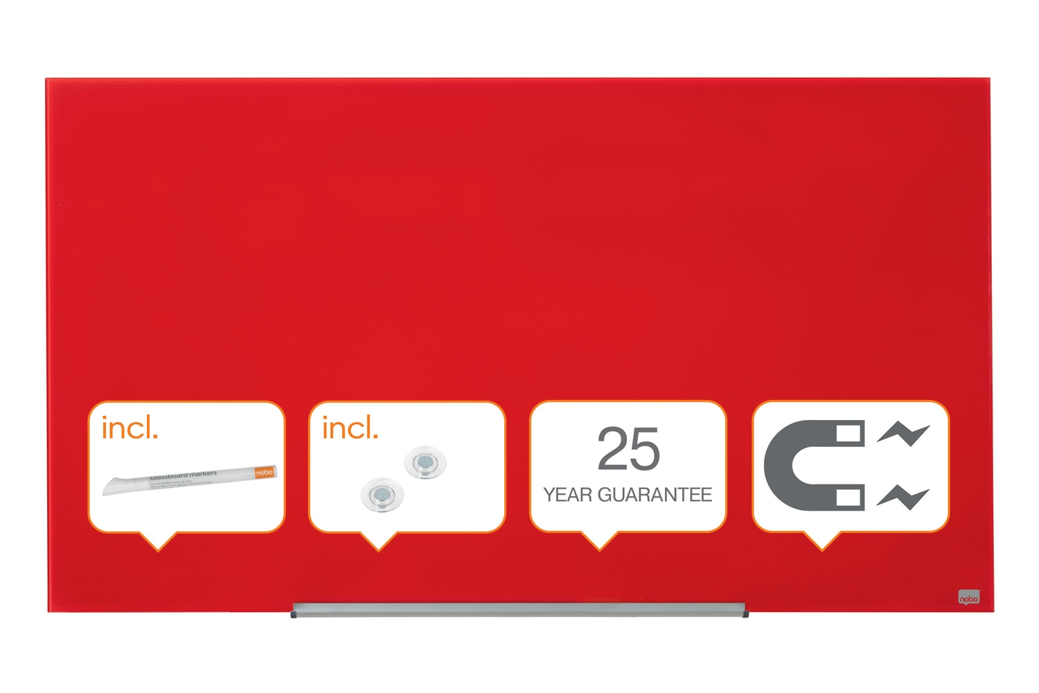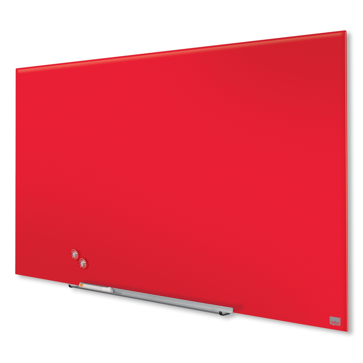 Flott rød glasstavle i stilfullt, modern rammeløs design fra Nobo som maksimerer skriveplassen på glasstavlen