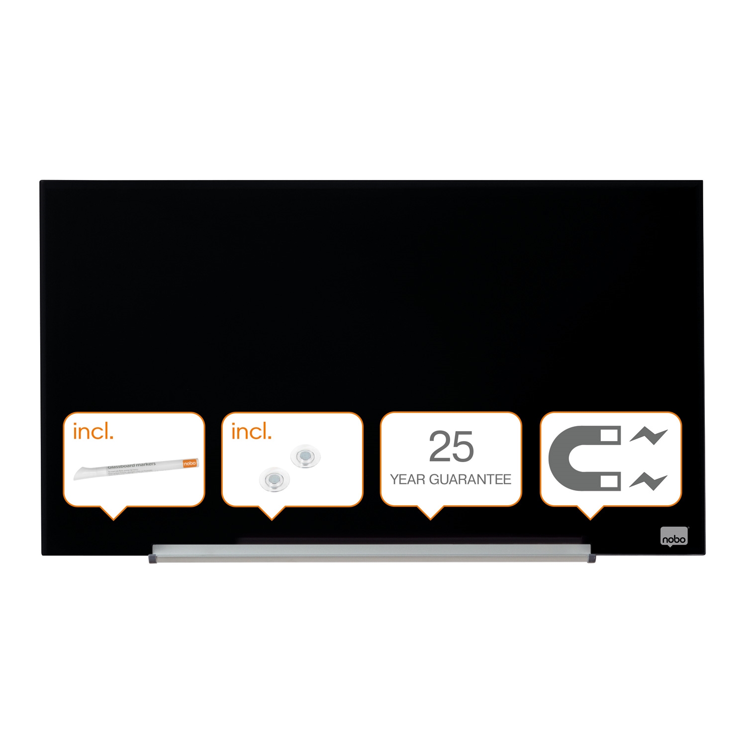 Leveres med Nobo whiteboard marker og et set ekstra sterke glasstavlemagneter