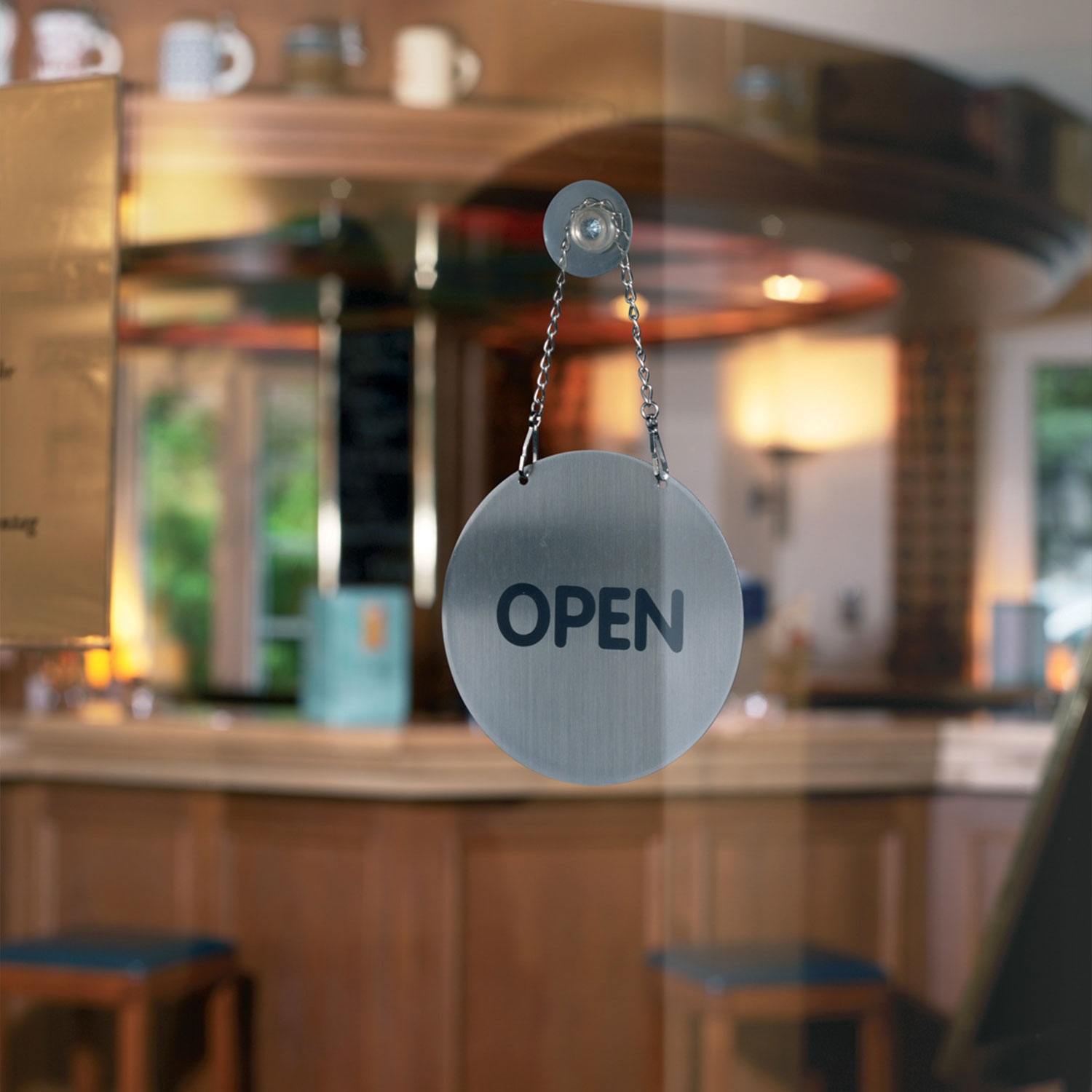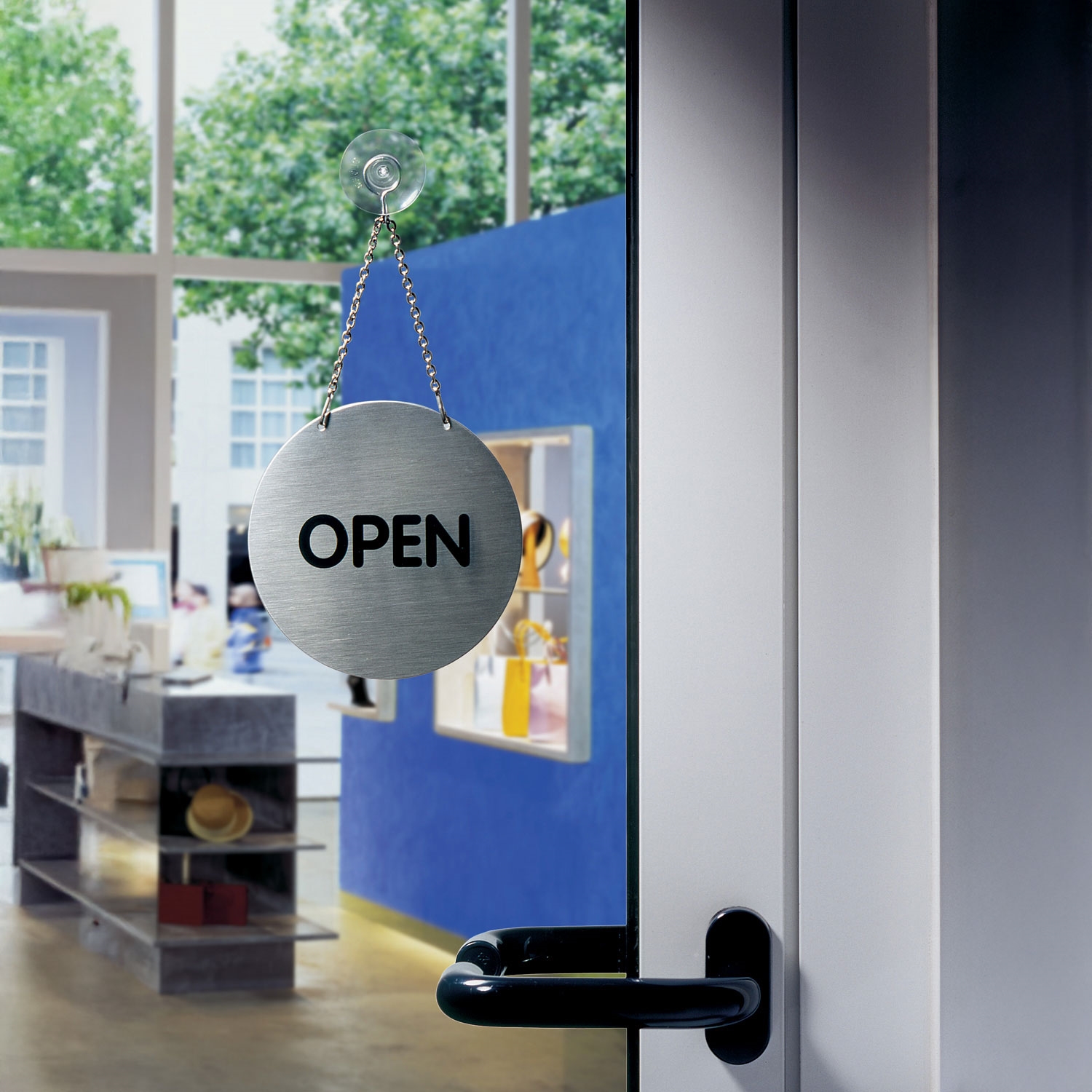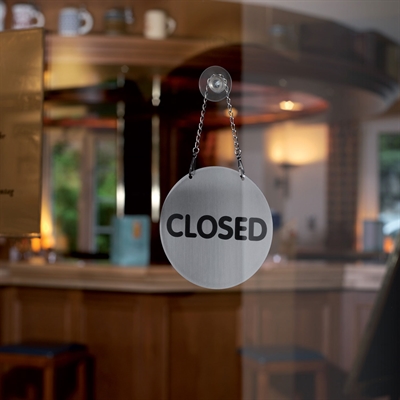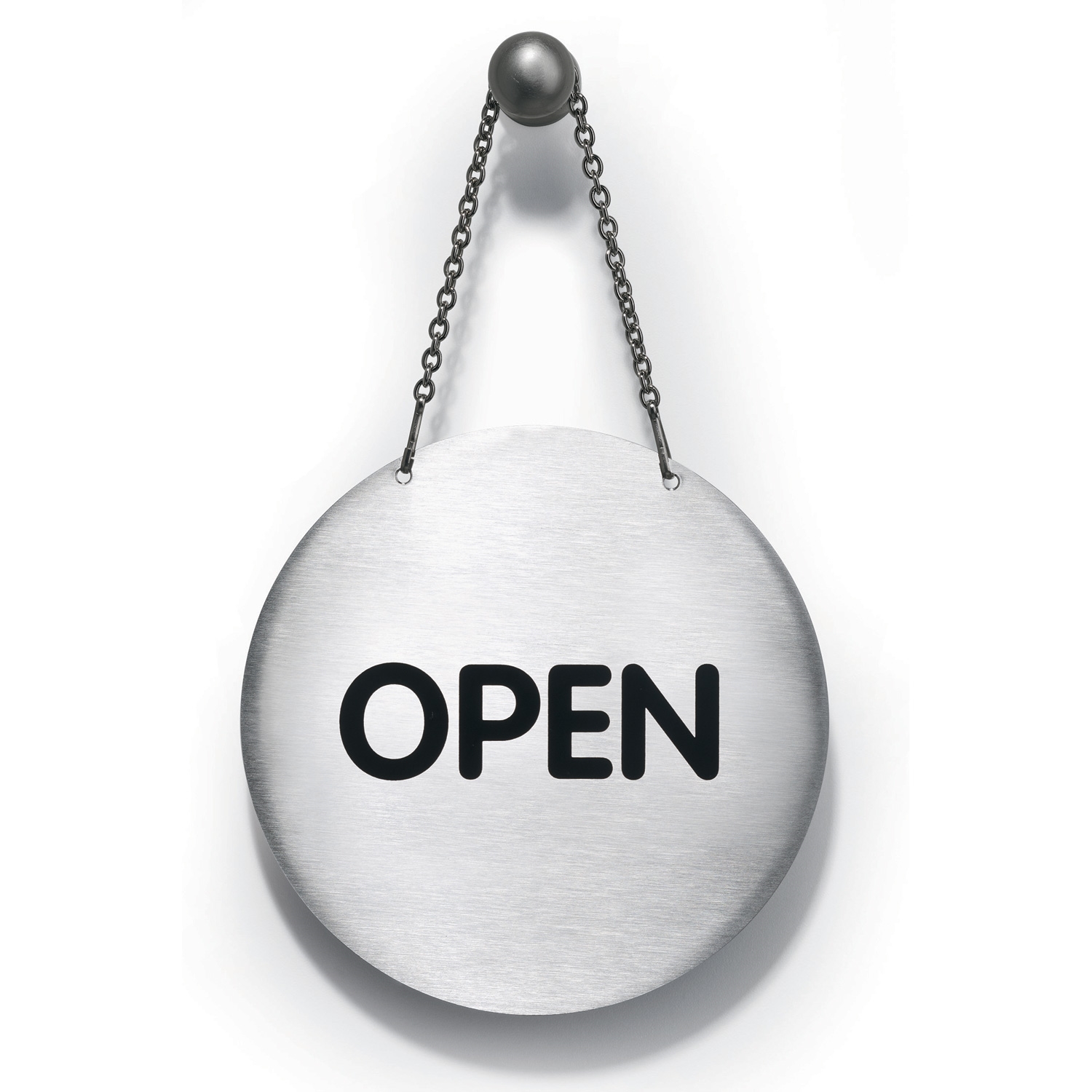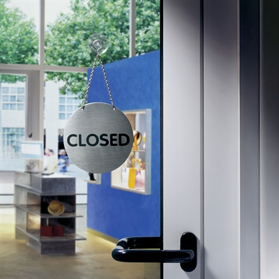Vendbart skilt med teksten OPEN på den ene siden og CLOSED på den andre. Et stilrent og praktisk skilt i børstet rustfritt stål - ideelt for butikker, kafeer og kontorer som ønsker å vise om det er åpent eller stengt.