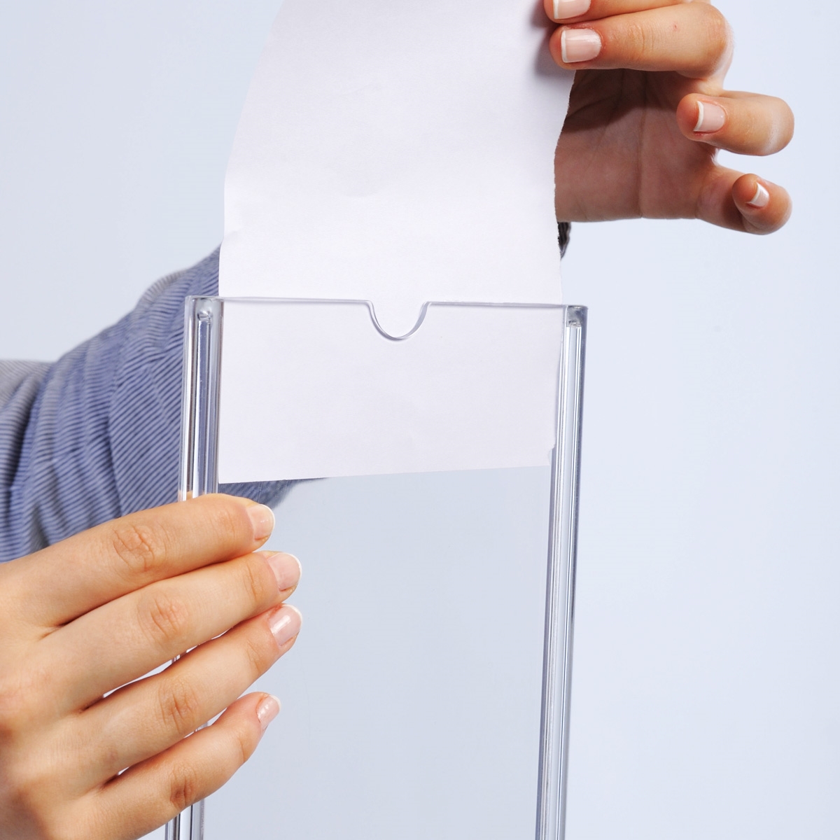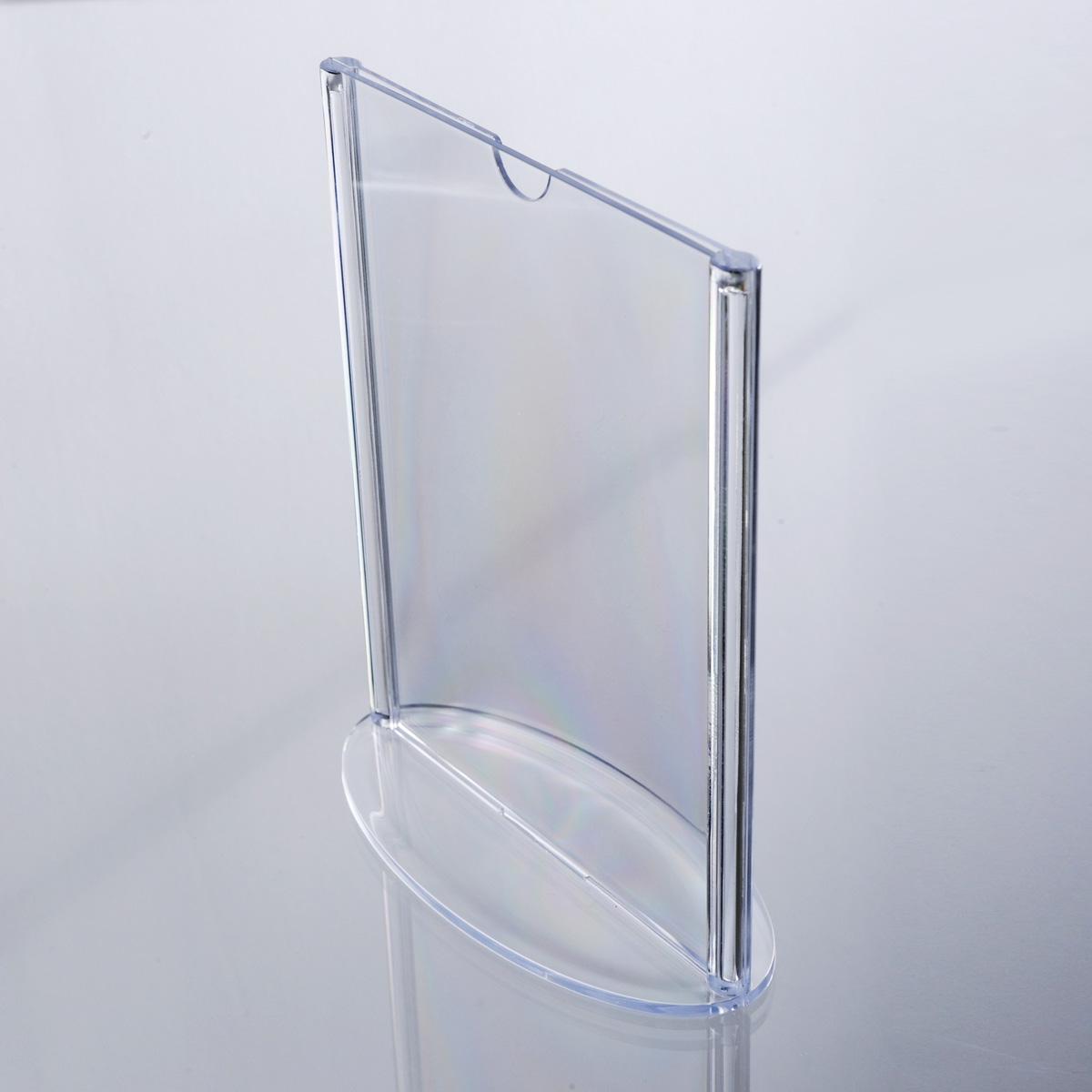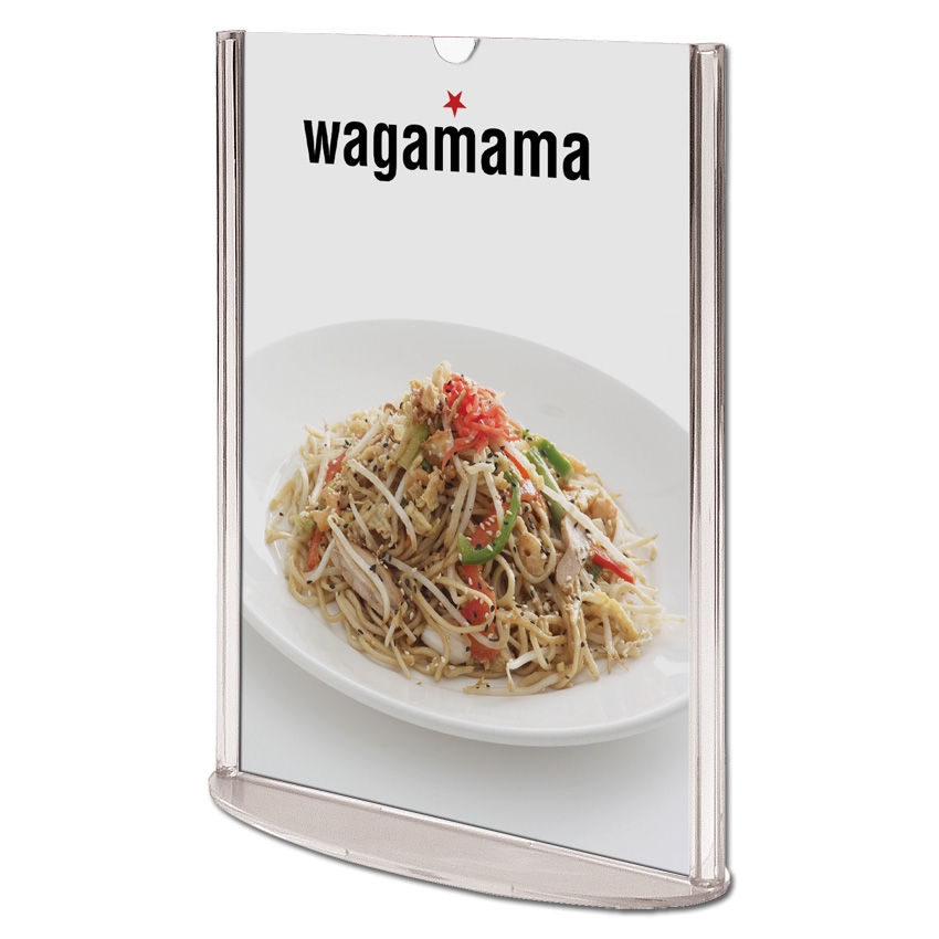 Super praktisk menyholder fremstillt i tykk, glassklar akryl. Menyen settes inn fra toppen, som både gjør at budskapet er enkel at skifte og at menyholderen kan tåle at bli flyttet rundt av kundene.