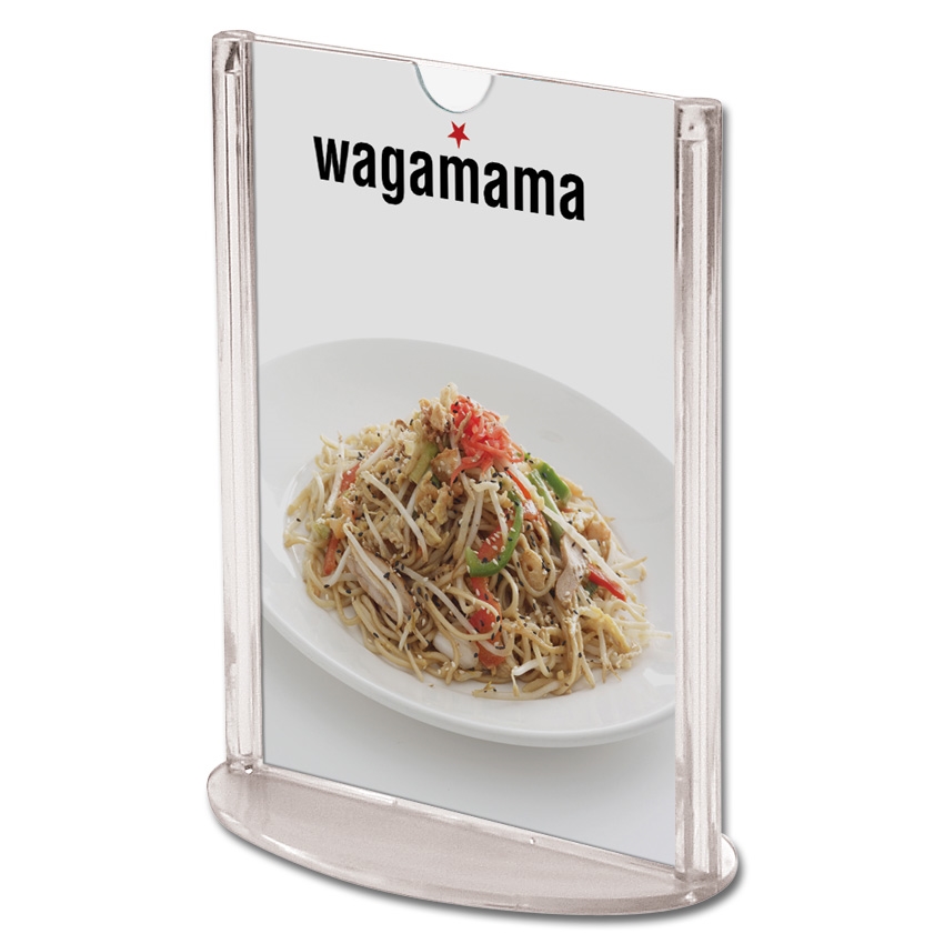 Super praktisk menyholder fremstillt i tykk, glassklar akryl. Menyen settes inn fra toppen, som både gjør at budskapet er enkel at skifte og at menyholderen kan tåle at bli flyttet rundt av kundene.
