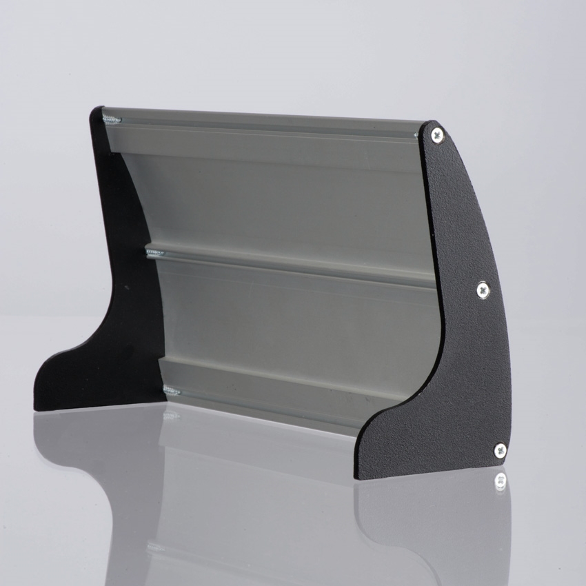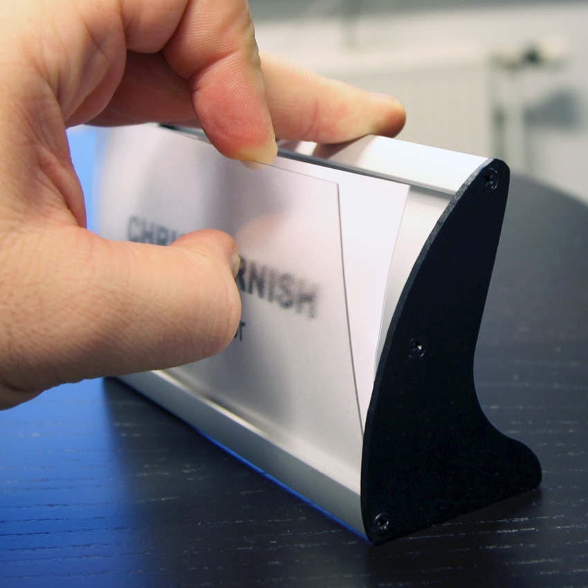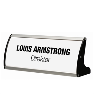 Smarte bordskilt utført i eloksert aluminium med sorte endestykker og antireflekterende frontplate.