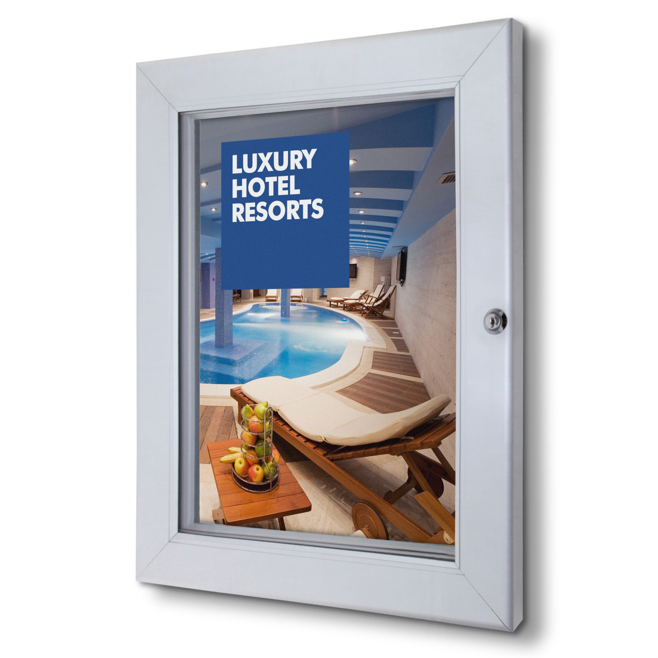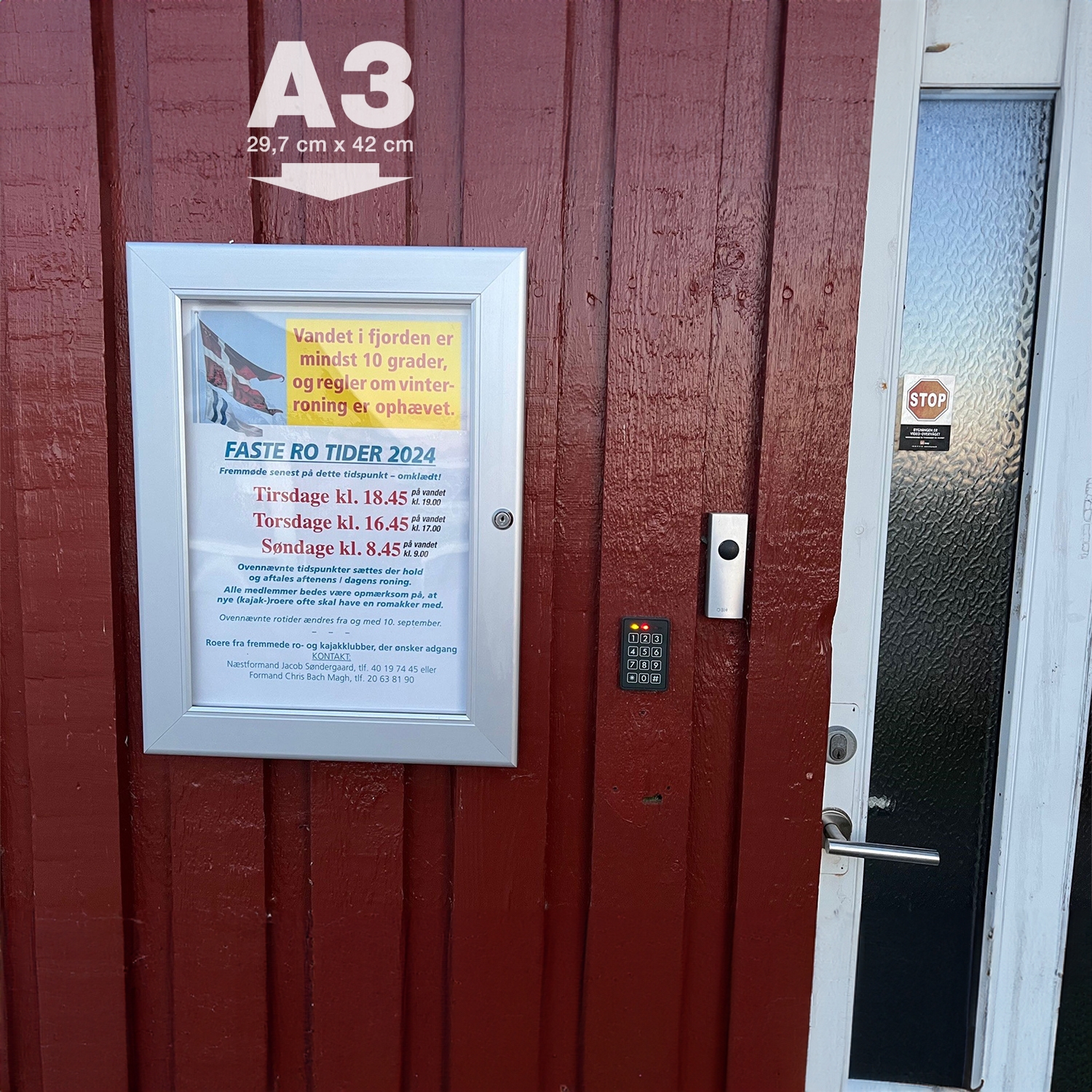 Vårt plakatskap har en flott 45 mm profil og frontruten er laget av slagfast polykarbonat.