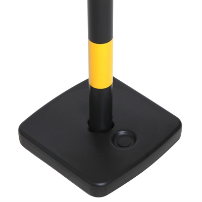 Solid og praktisk Avsperringsstolpe i plast med svart/gul mønster. Basen kan fylles med sand eller vann for ekstra stabilitet. Ideell for midlertidig sperring ved arrangementer, byggeplasser eller parkeringsområder.