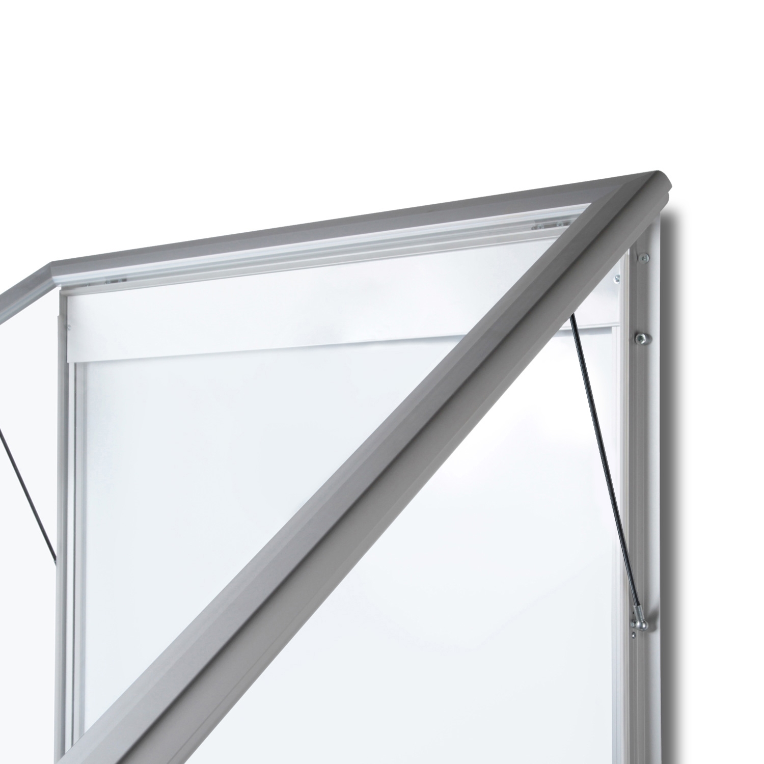 På størrelsene: 12xA4, 15xA4, 18xA4, 21xA4, 24xA4 og 27xA4 er uthengsskapen topphengslet montert med gassfjær som gjør at døren holder sig selv åpen, samtidig du skifter plakatene / oppslagene.