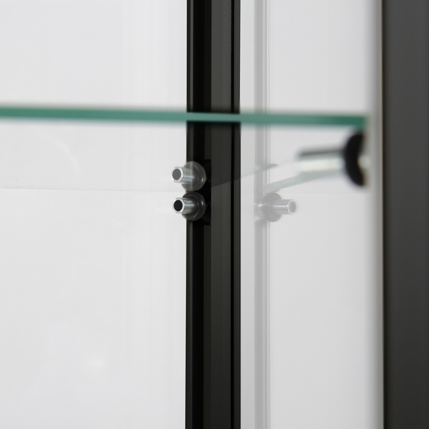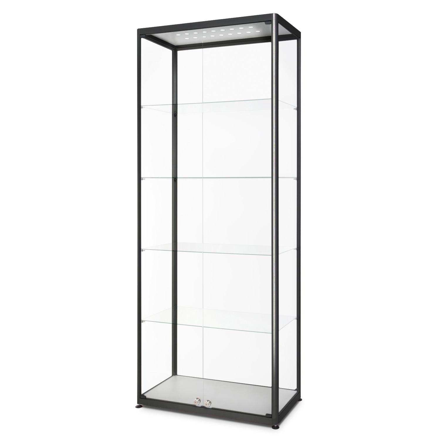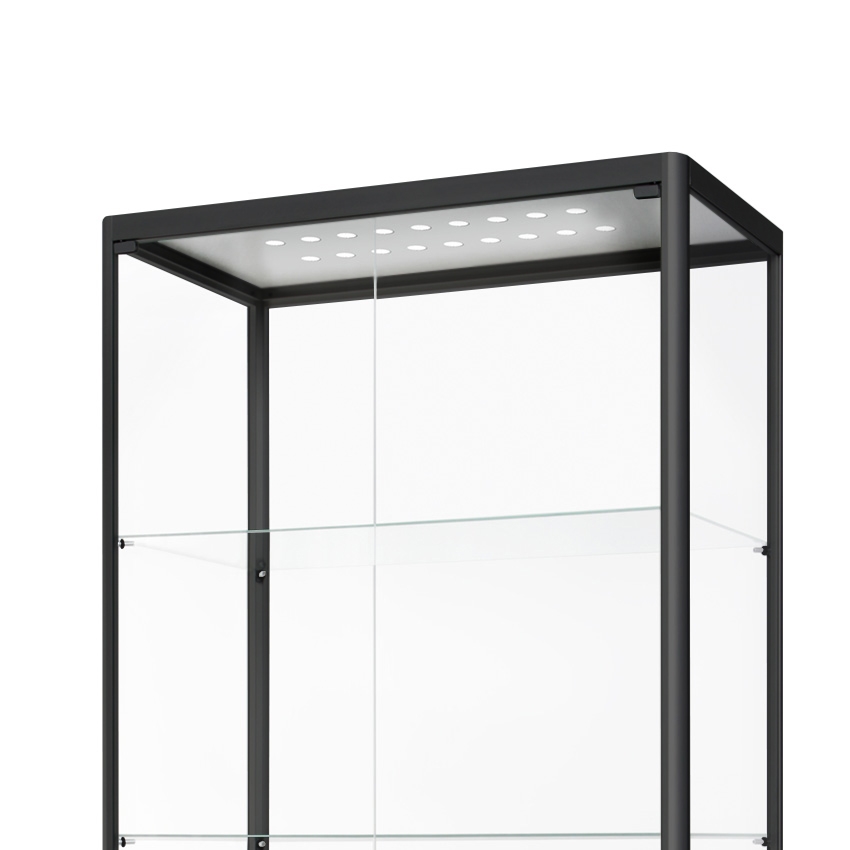 Premium vitrineskap i glass med LED-lys i moderne design og med anodiserte alu-profiler i sort.