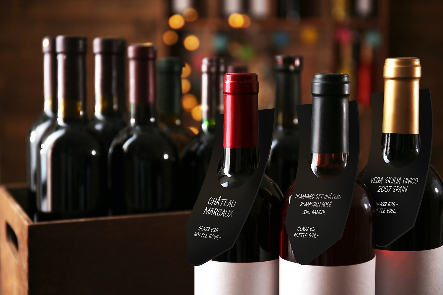 Presenter dine drikkevarer på profesjonell manér, med disse fleksible prisskilter til flasker. Skiltene kommer i set med 10 stk, og har skrivbar krittoverflate som kan skrives på med den inkluderte hvite kritt marker pennen på 1-2mm.