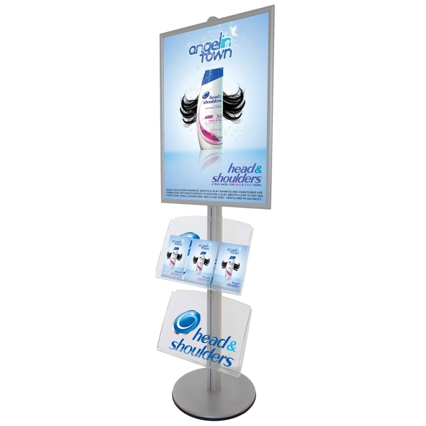 Informasjonsstativ av aluminium med akrylhyller og en ekstra tung fot for stabilitet.