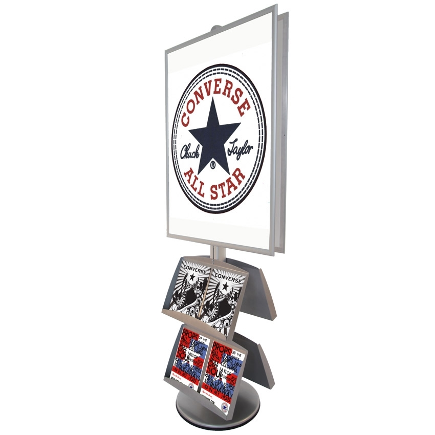 Dobbelsidig Info display av aluminium med stålhyller og en ekstra tung fot for stabilitet.
