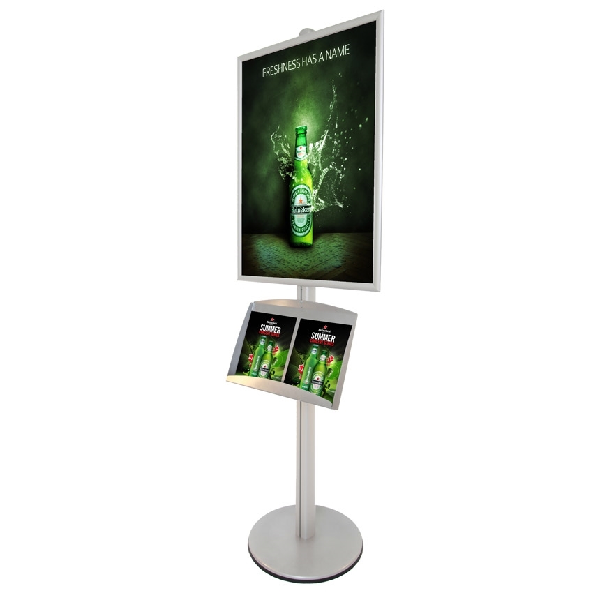 190cm høy infostand som krever oppmerksomhet. Disse allsidige displays er montert med 1 stk A1 format snappramme og 1stk stålhylle som kan holde 2stk A4 brosjyrer eller aviser.