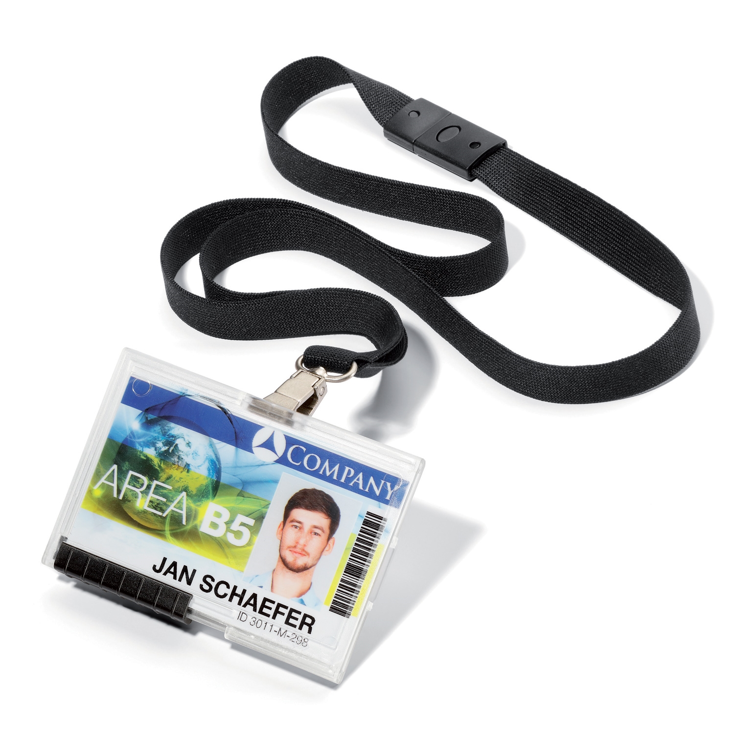 Levereres med 15 mm bredt tekstilhalsbånd og passer til kort med maksimale dimensjoner 54x87 mm.