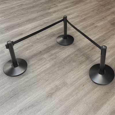 QueueMax Mini er en svart avsperringsstolpe på 51 cm, produsert i galvanisert stål med en tung betongfylt fot med gulvbeskyttelse. Den kompakte høyden gjør den til en elegant og diskret køleder, perfekt til museer, utstillinger, showrooms og andre steder hvor en tydelig men lavmælt avsperring er ønsket.