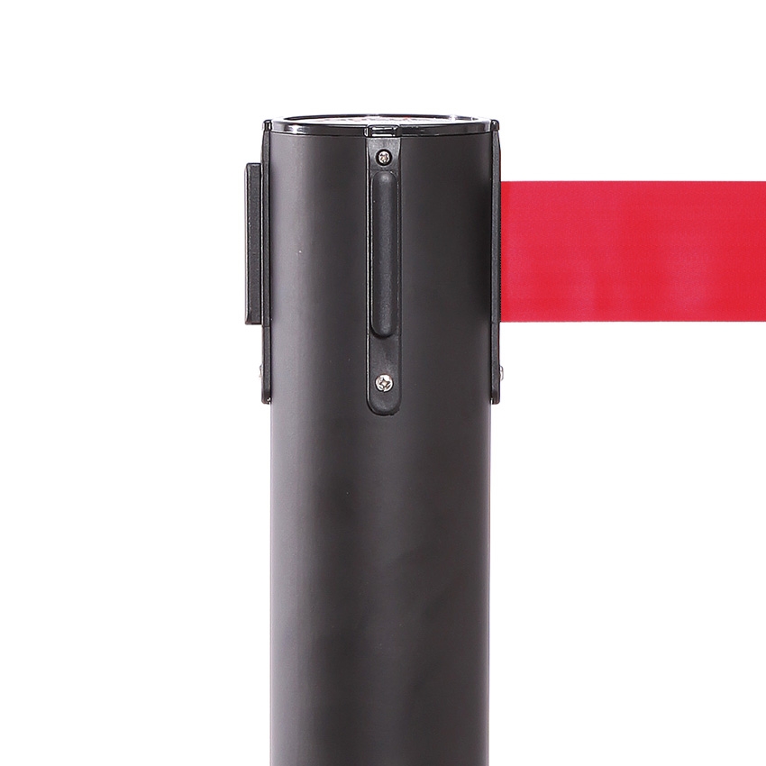 Disse avsperringsstolper har et avansert sikkerhetsbremsesystem – Dette betyr at hvis bånden bliver tapt, så faller det ned på gulvet og trekker sig langsomt tilbake inn i spolen.