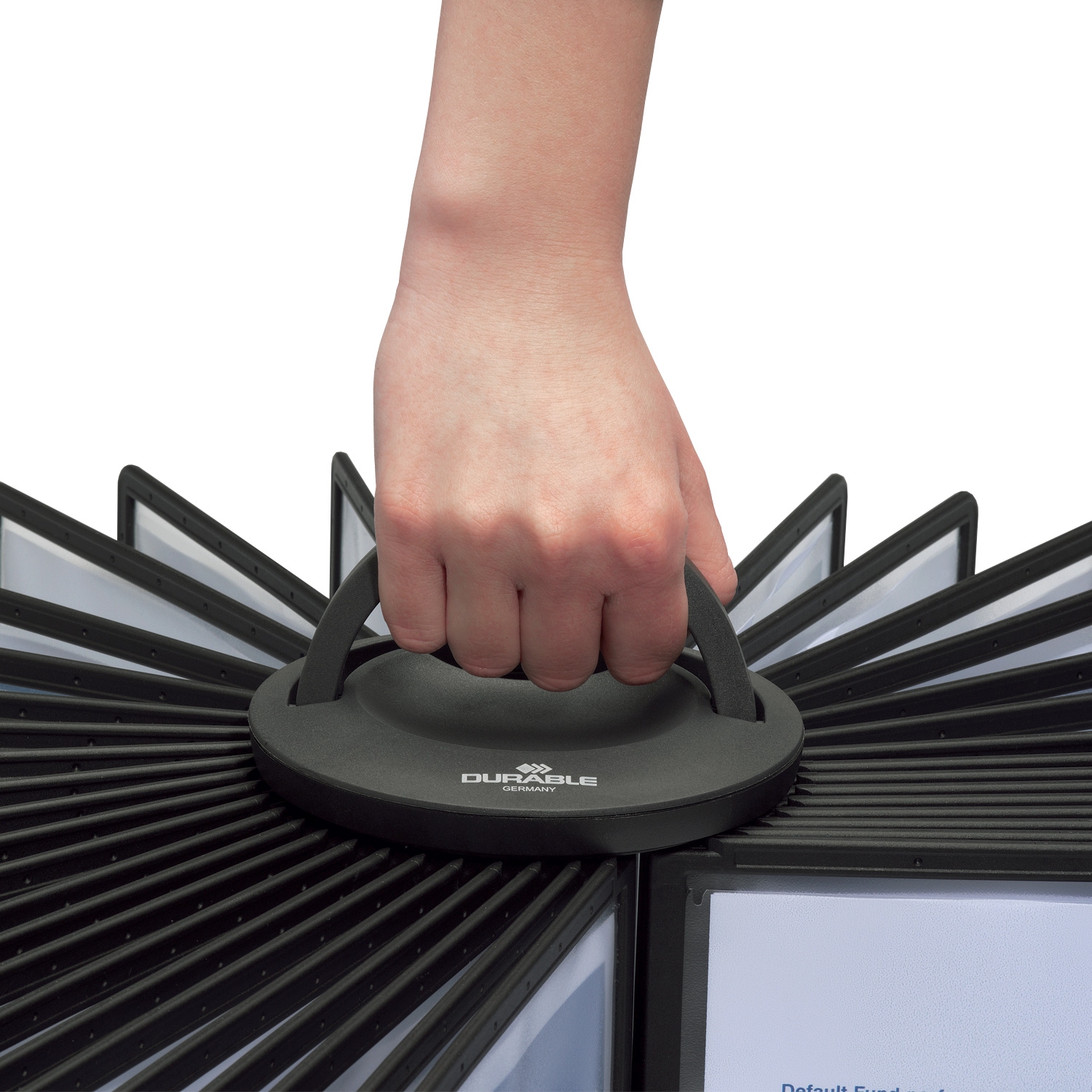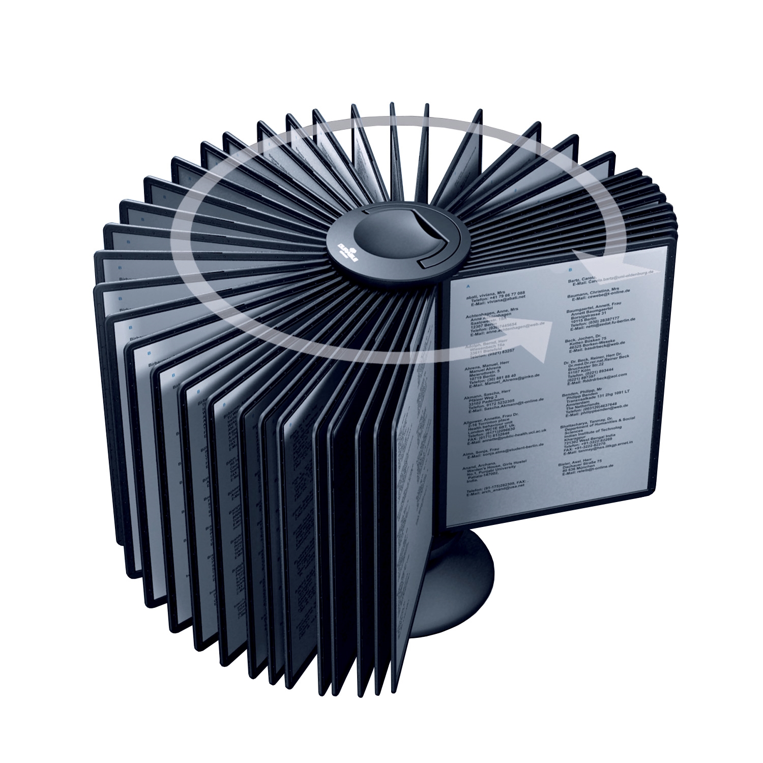 Roterende registersystem. Komplett med 40 svarte display paneler i A4 størrelse, samt en tung stabil skli sikker senterbas. Kommer med håndtag i midten som gjør det mulig og enkelt at flytte systemet rundt til forskjellige lokasjoner. Dette smarte system tilbyr rask adgang til et bredt sortiment av informasjon via dets 40 paneler som er lette at sett i og skifte ut.